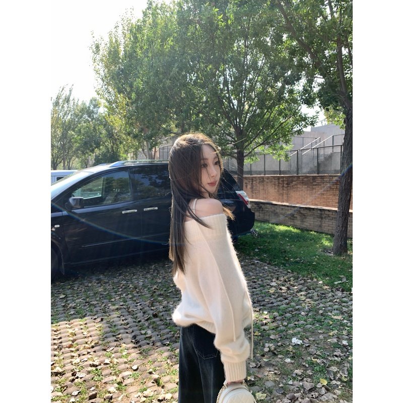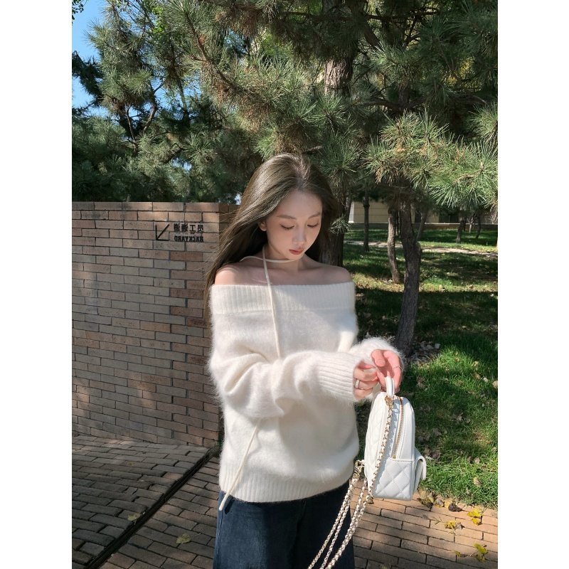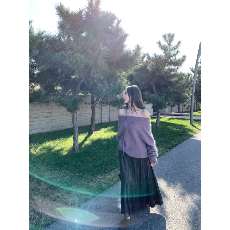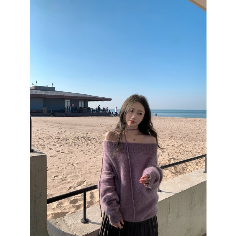 📚 韩版气质紫色一字领飘带毛衣女2025年秋冬季时髦百搭长袖露肩上衣