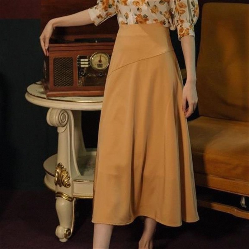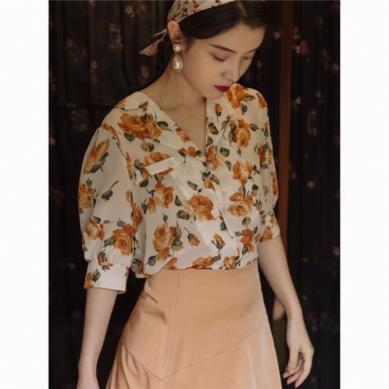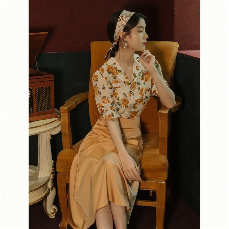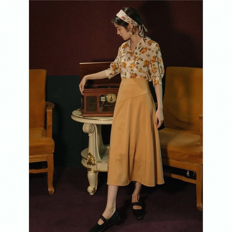 📚 夏港风套装女花色衬衫复古高腰黄色半身裙气质显瘦轻熟两件套裙子