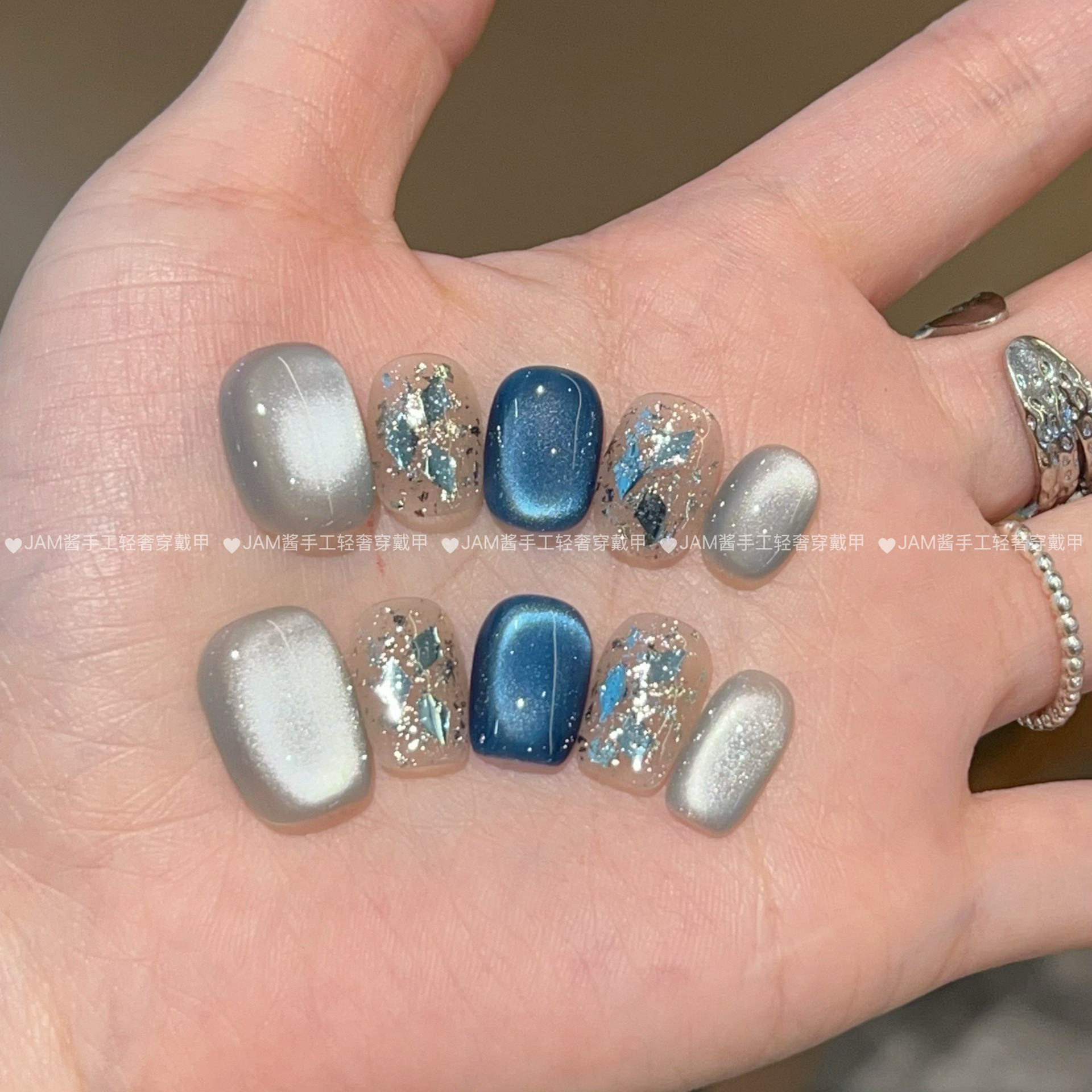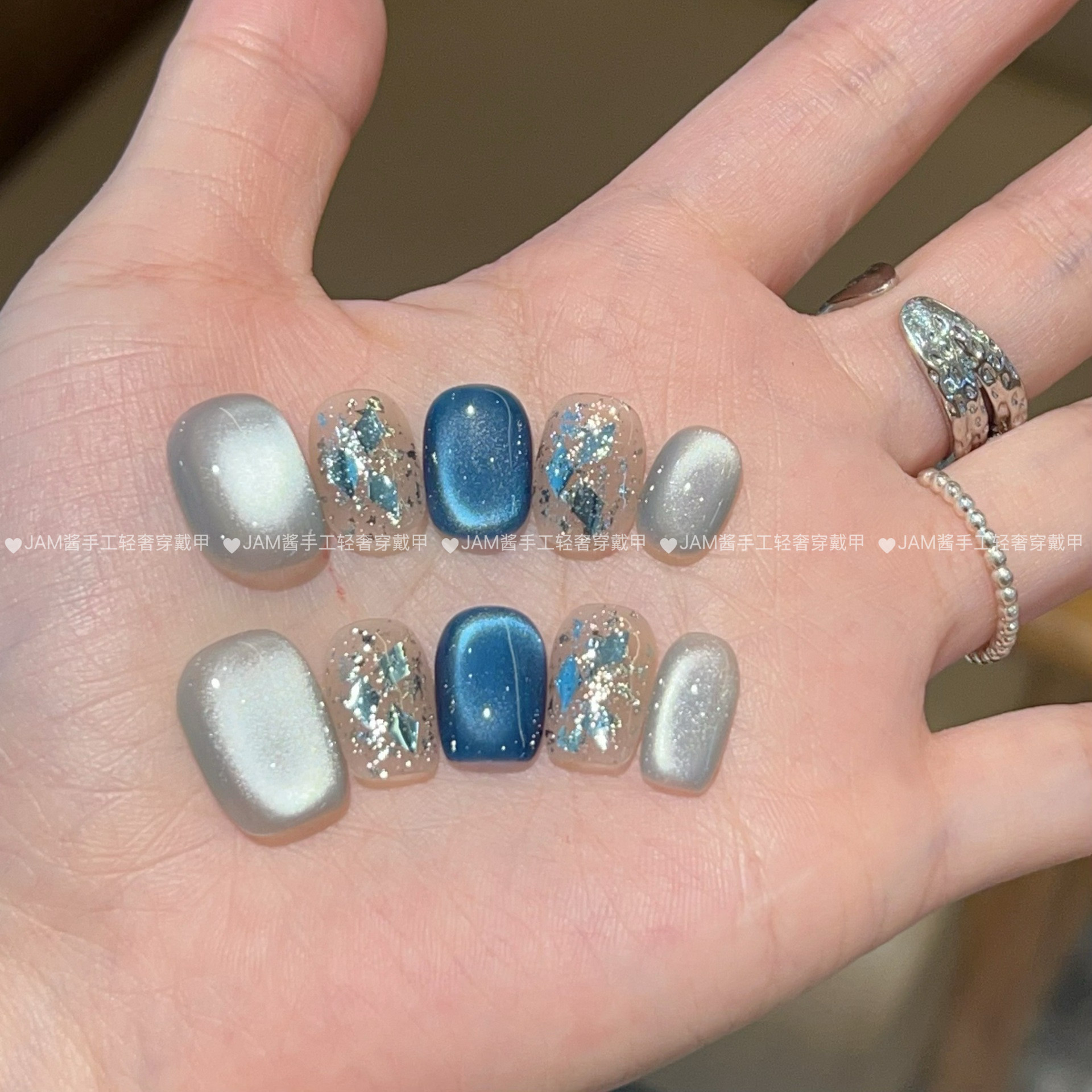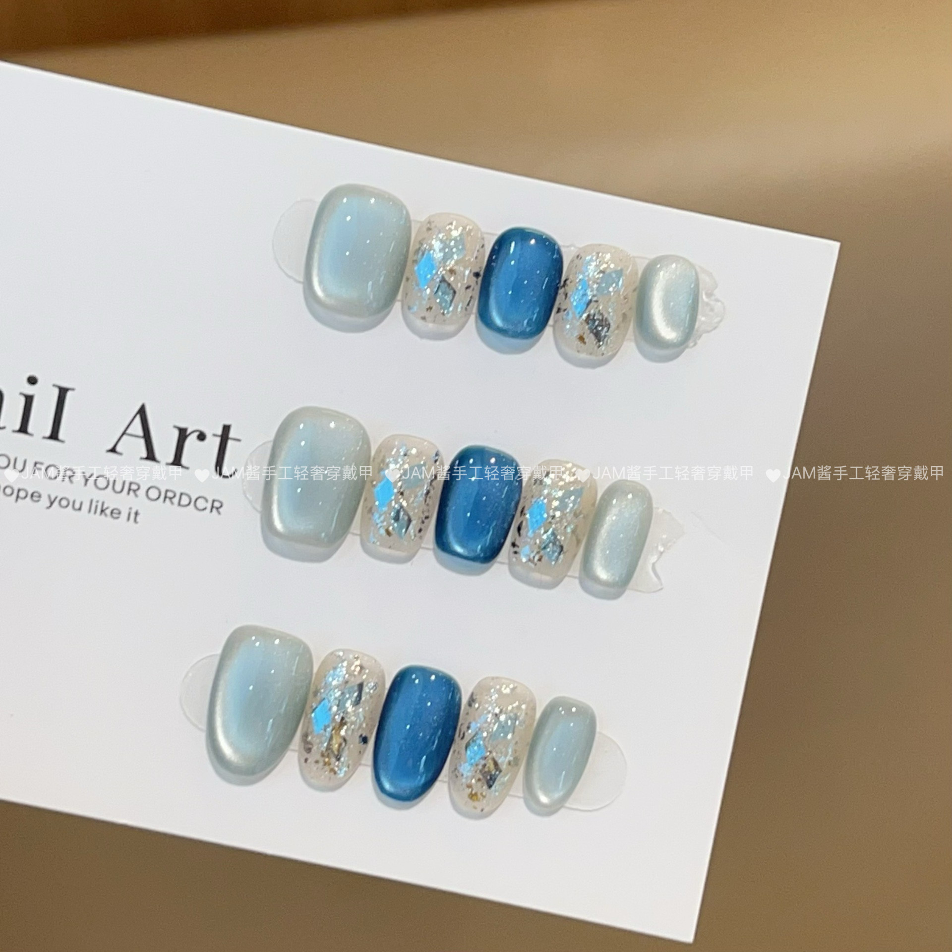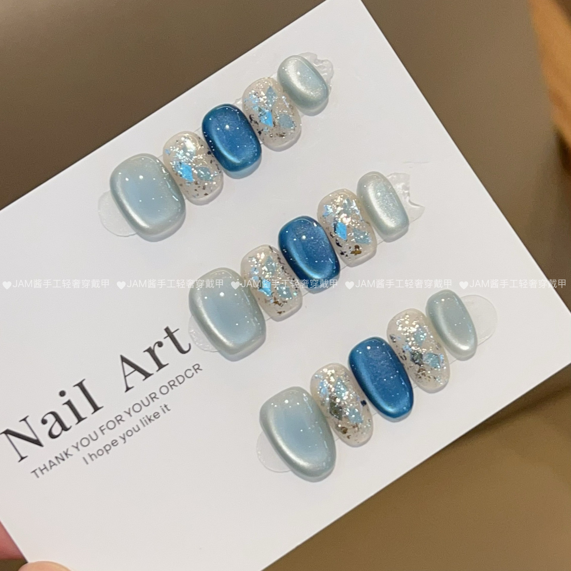 📚 不眠岛 新款纯手工穿戴甲短款蓝色猫眼穿戴美甲短椭圆显白高级感
