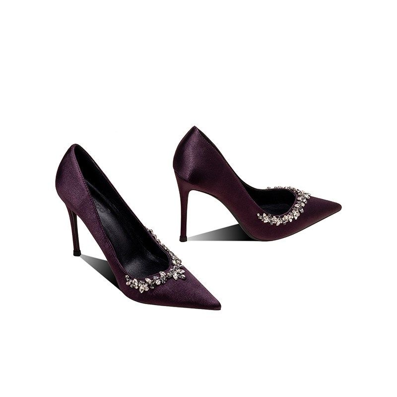 📚 2025春新款紫色水钻高跟鞋女气质不累脚细跟尖头绝美缎面单鞋配裙