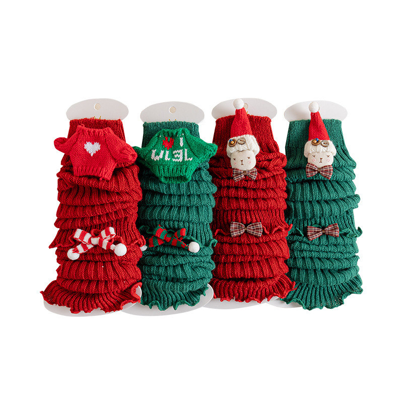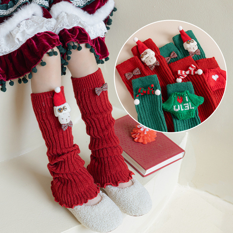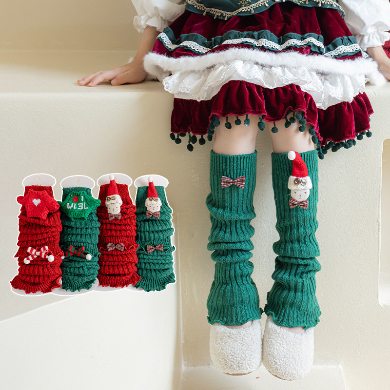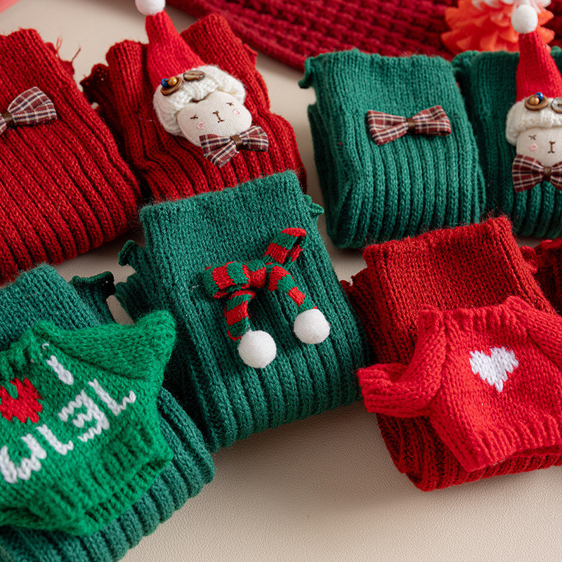 📚 女童圣诞袜套冬保暖红色绿色腿套宝宝日系毛线可爱雪人提花堆堆袜
