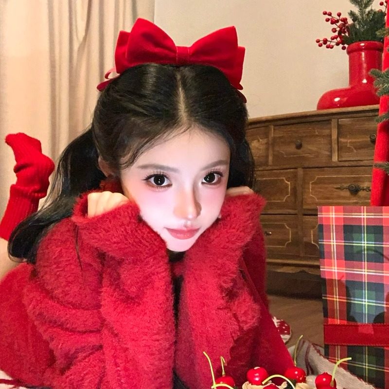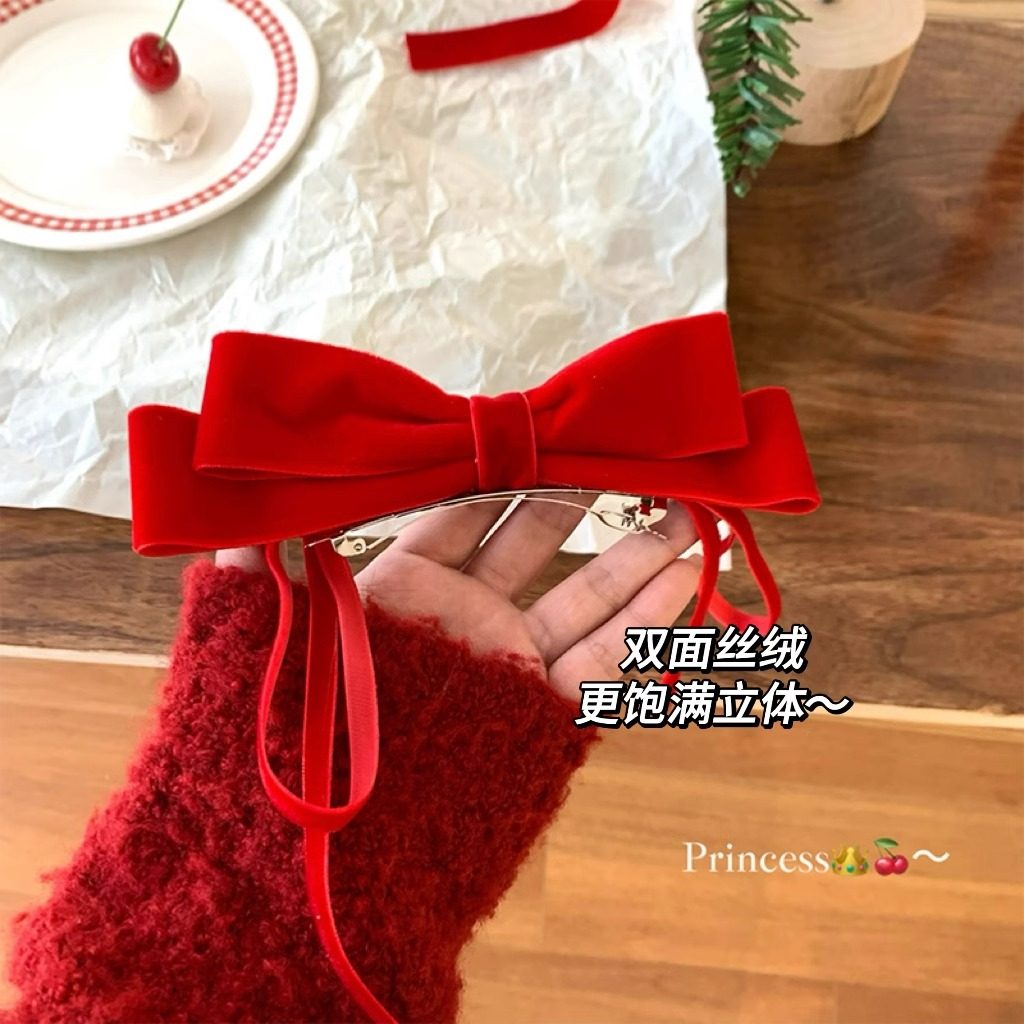 📚 新年红色丝绒蝴蝶结发夹子公主发饰女高级感显白发卡顶夹头饰发卡