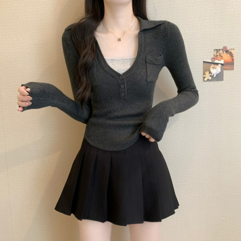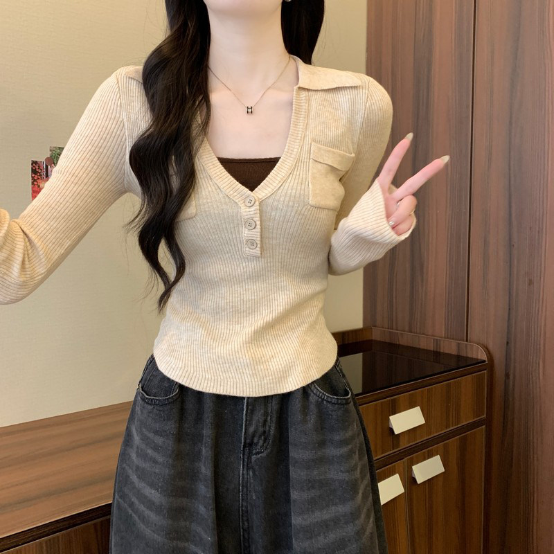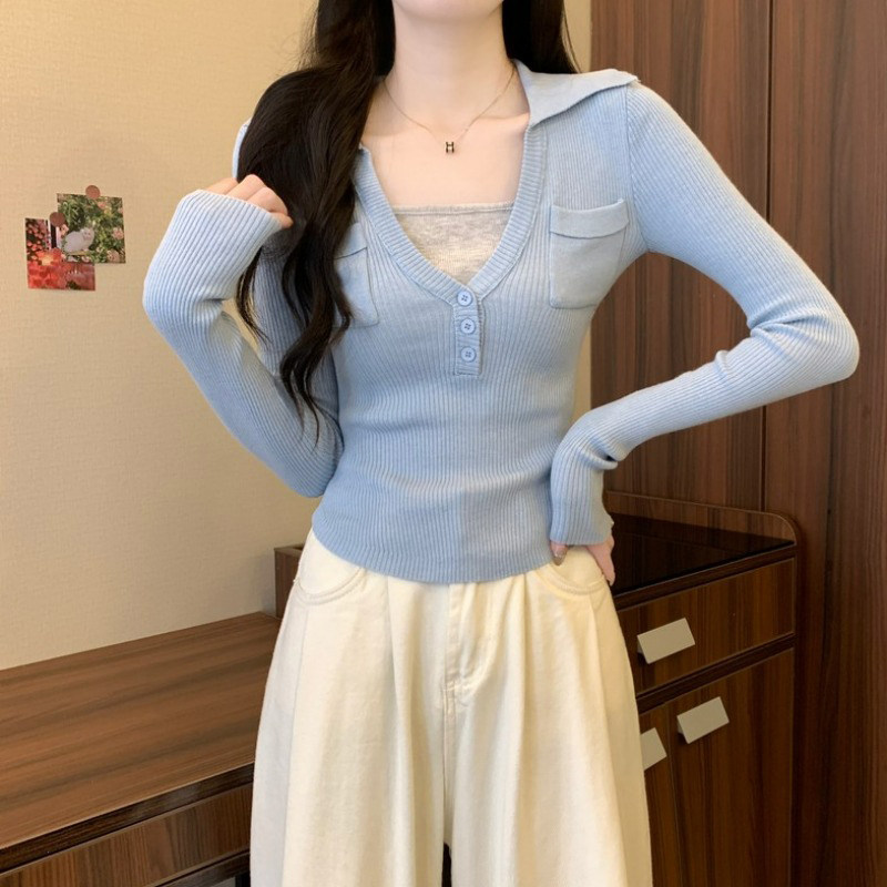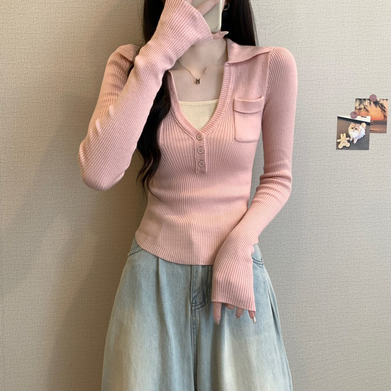 📚 假两件针织打底衫女春装2025内搭修身毛衣高级黄色miu里穿搭上衣
