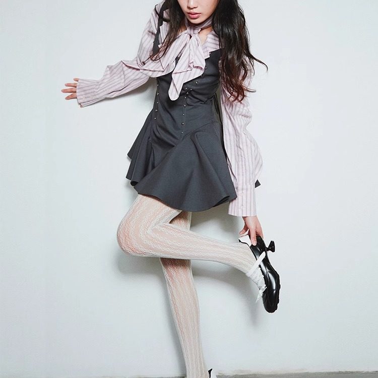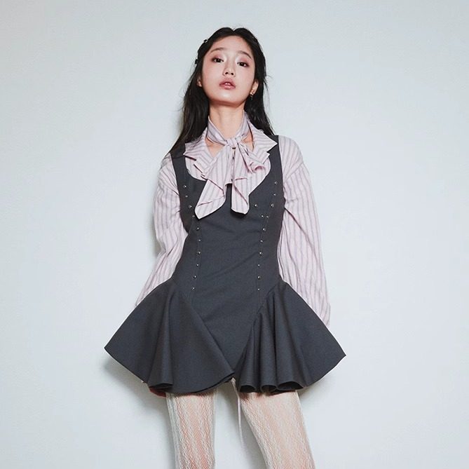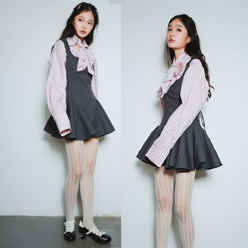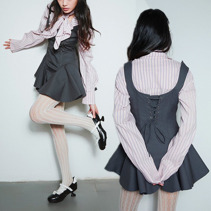 📚 SelfMing灰色铆钉连衣裙春季学院风宫廷蓬蓬裙辣妹鱼骨A字裙