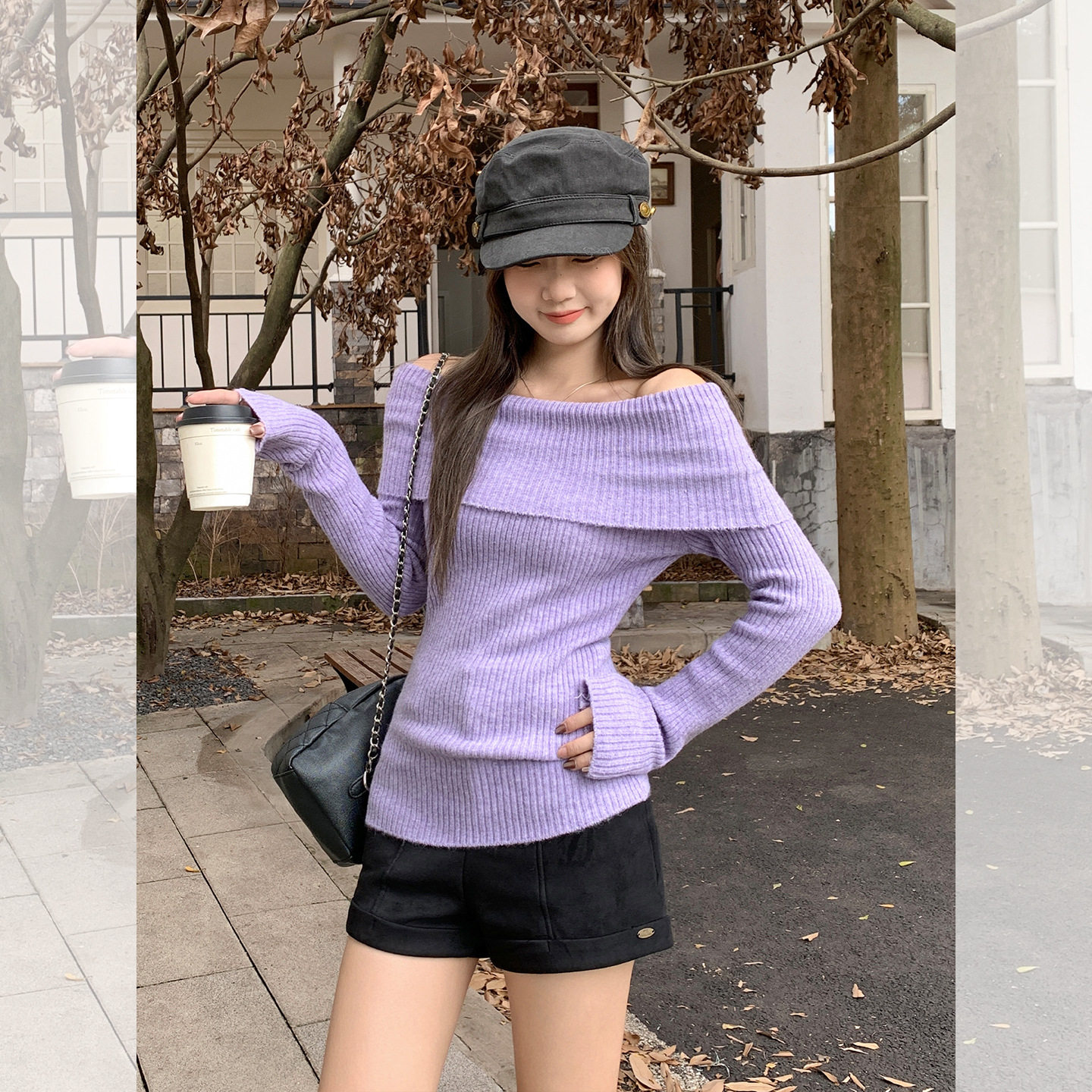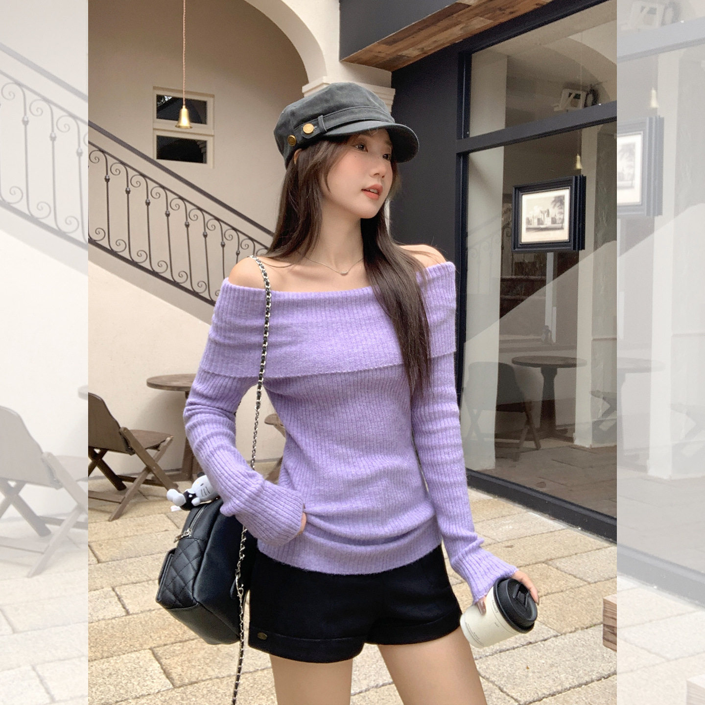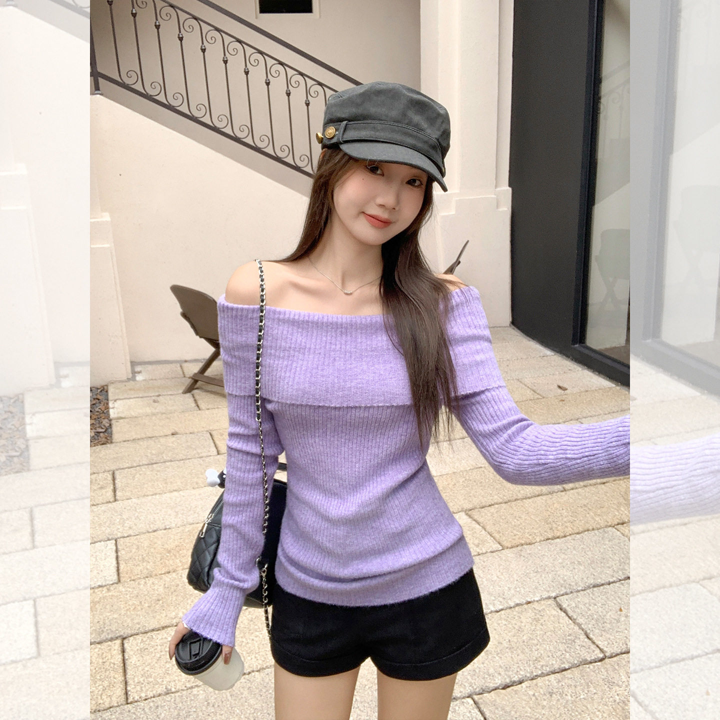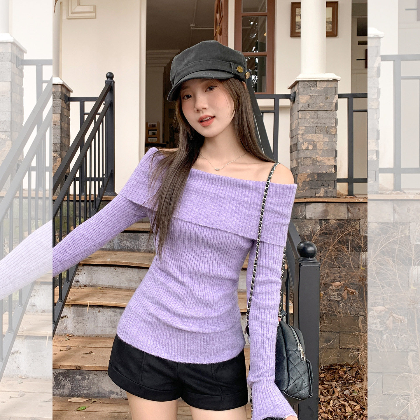 📚 紫色一字领露肩长袖针织打底衫内搭毛衣韩系早秋穿搭氛围感上衣