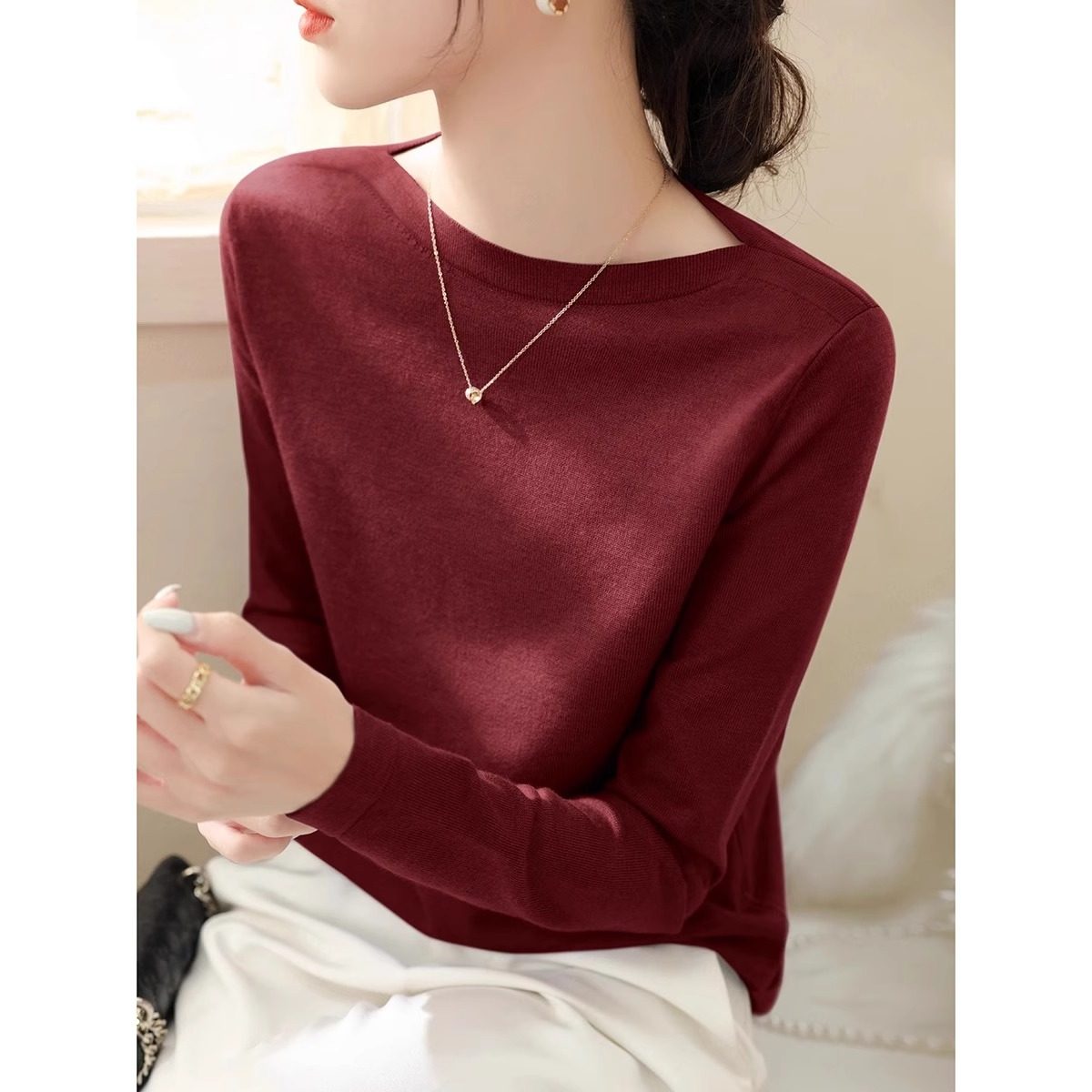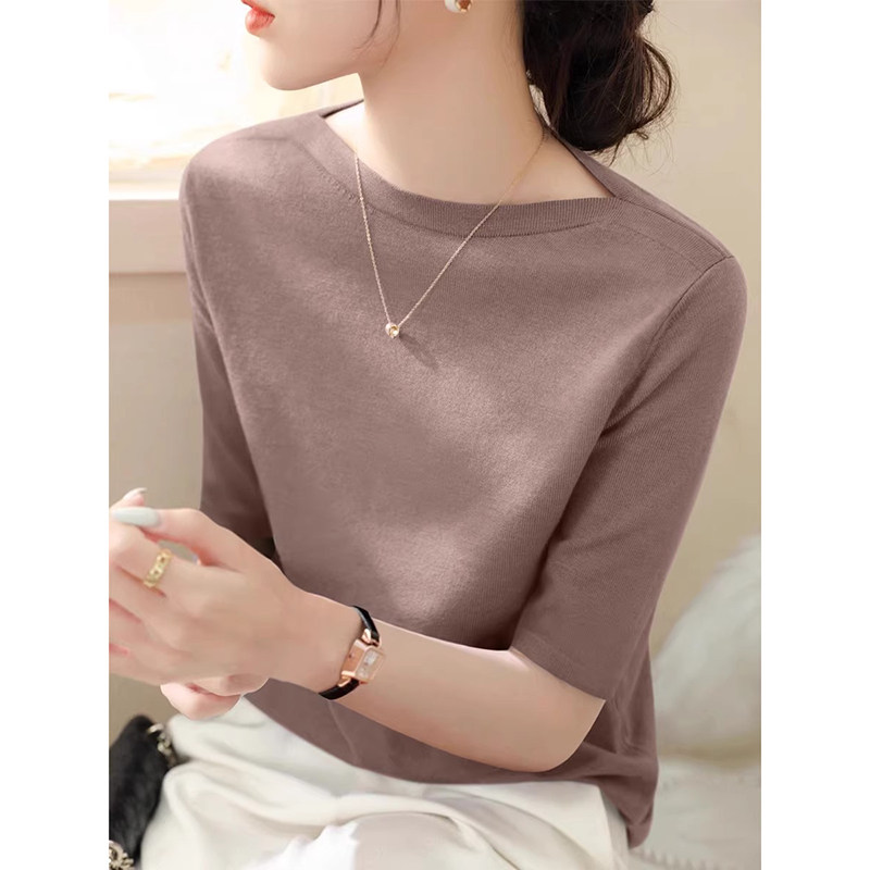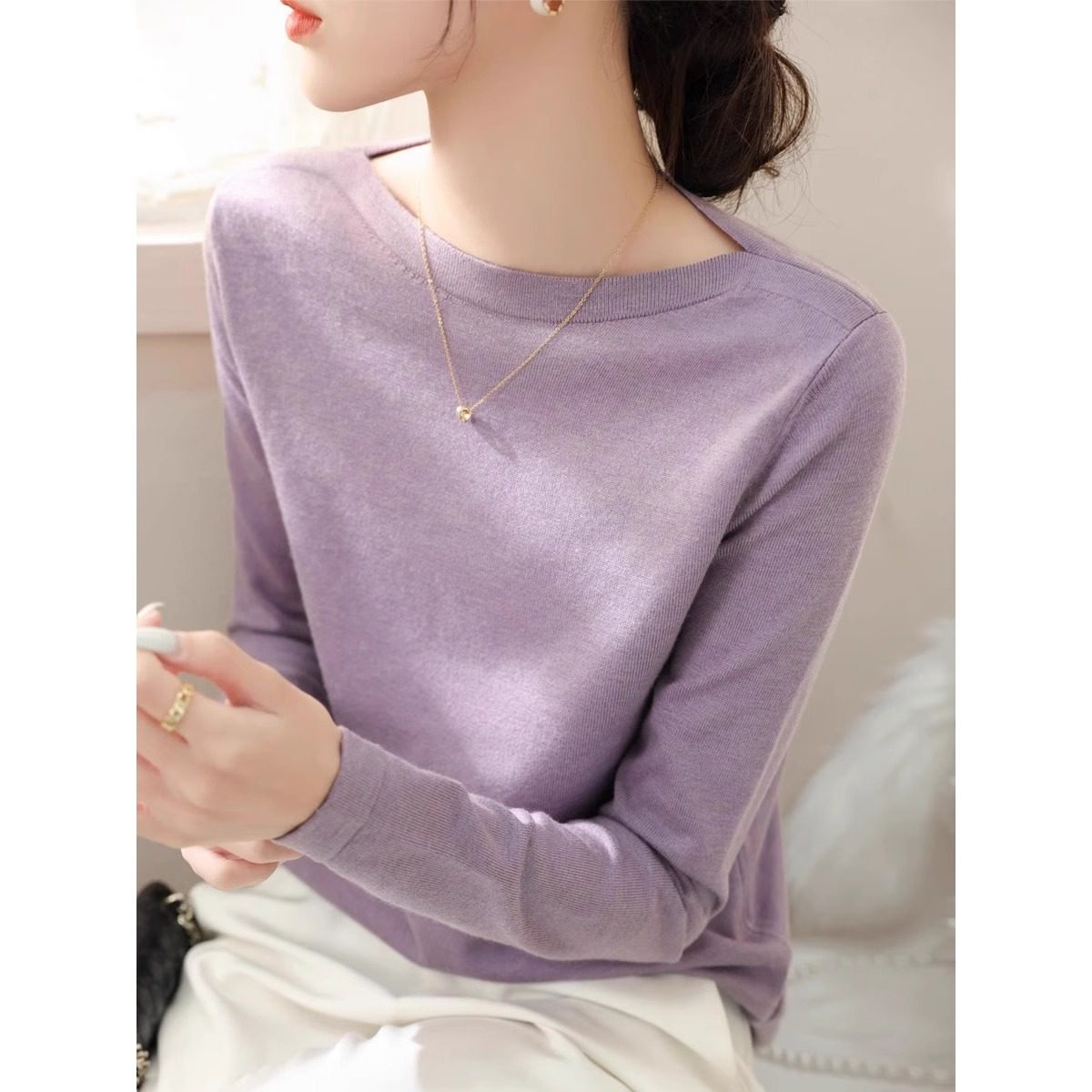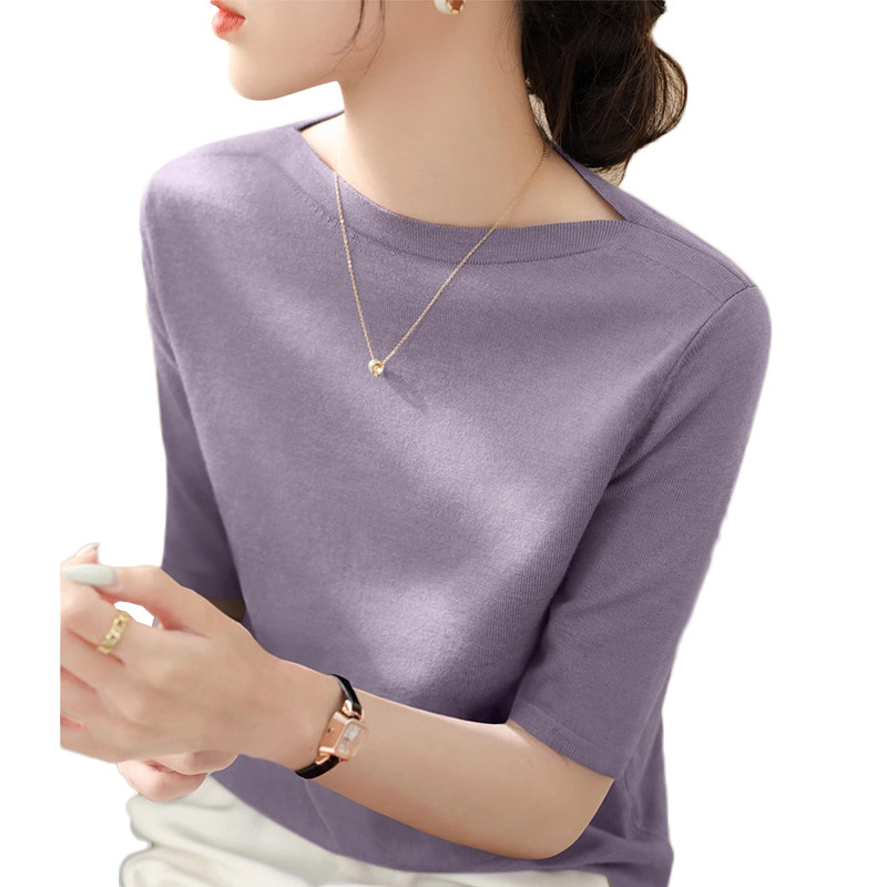 📚 新款春秋高级紫色一字肩领五分袖针织打底衫毛衣女装修身内搭上衣