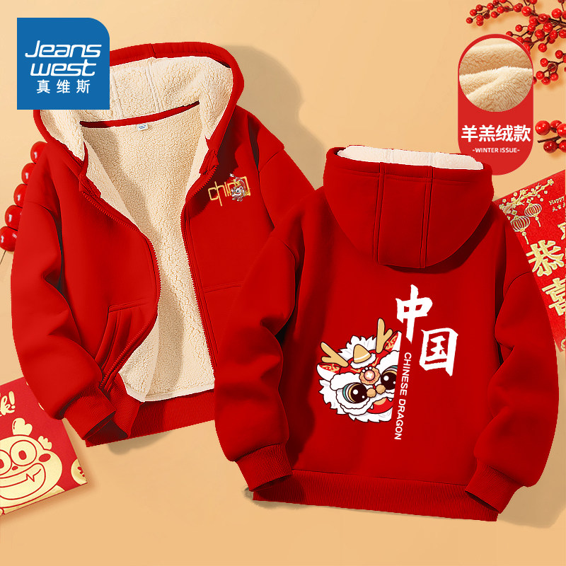 📚 真维斯男童红色外套2026新款唐装羊羔绒拜年服儿童本命年马年衣服