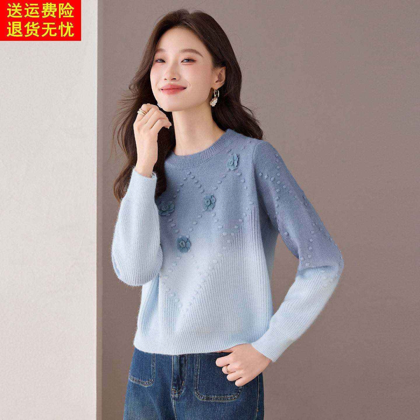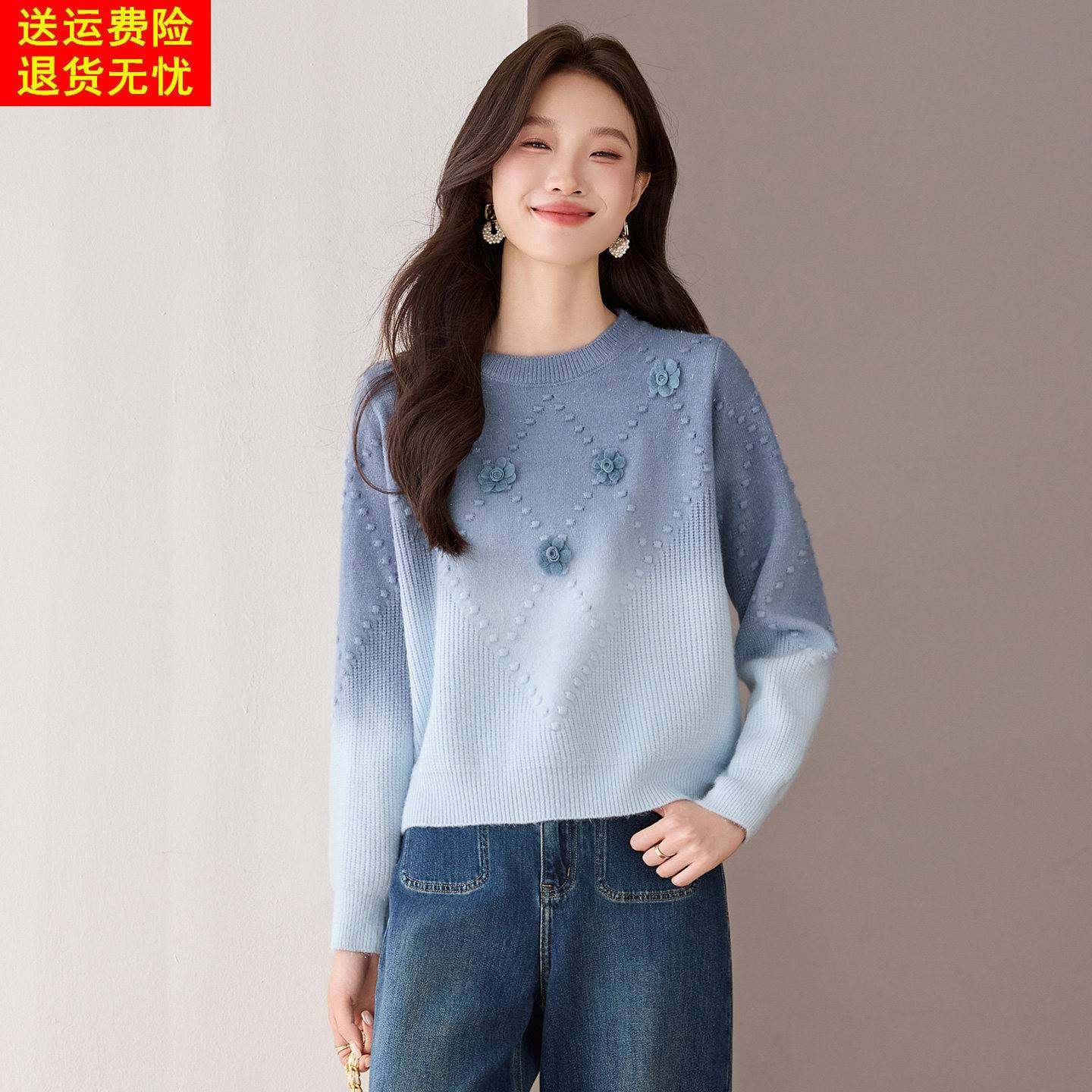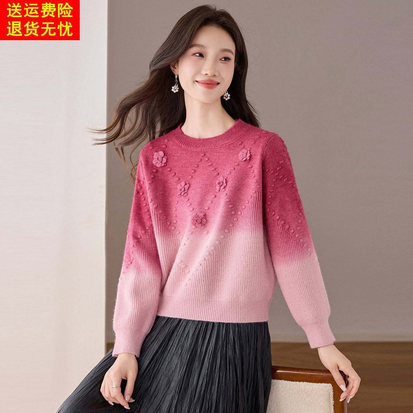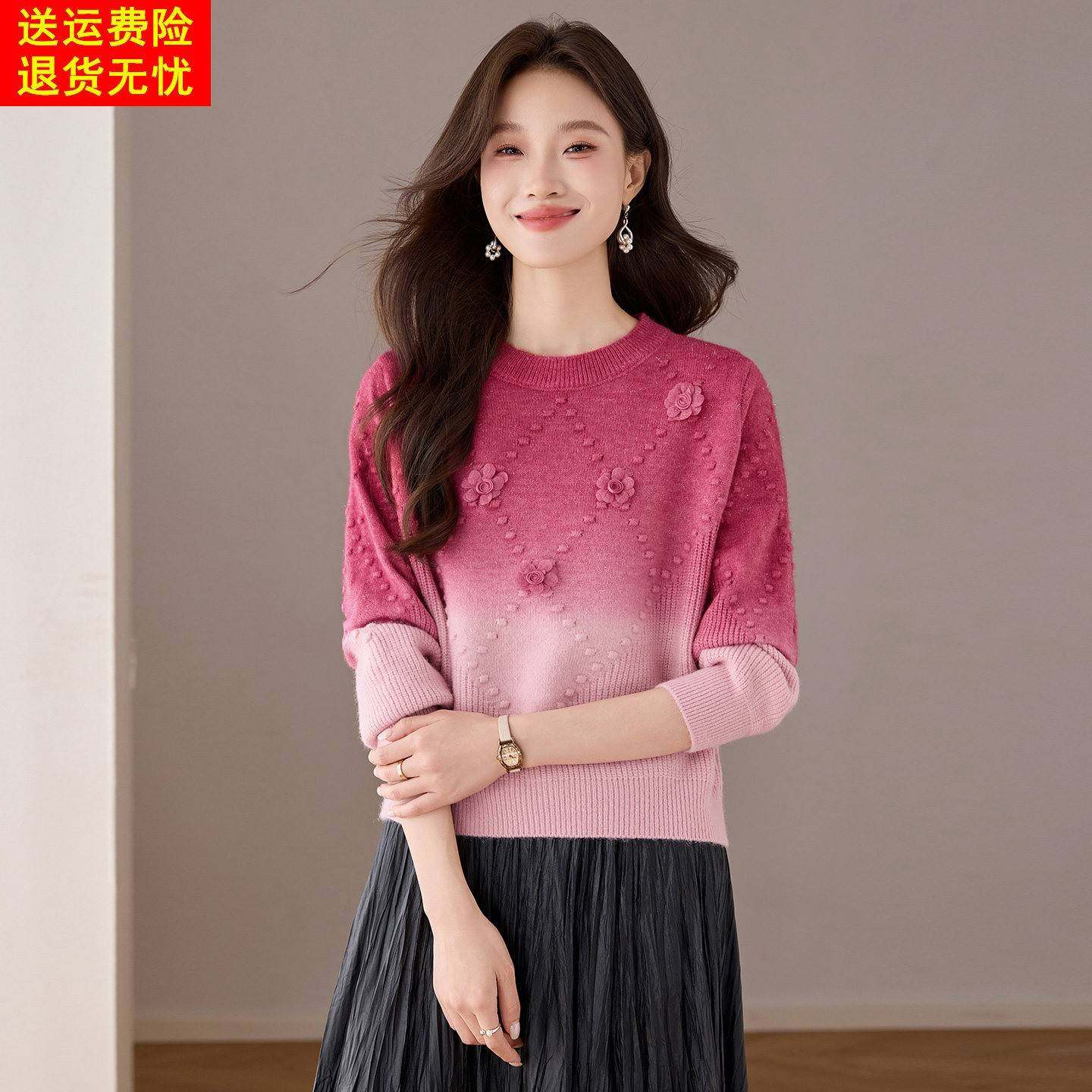 📚 立体花朵圆领渐变色毛衣女秋冬时尚宽松可外穿内搭打底衫减龄上衣