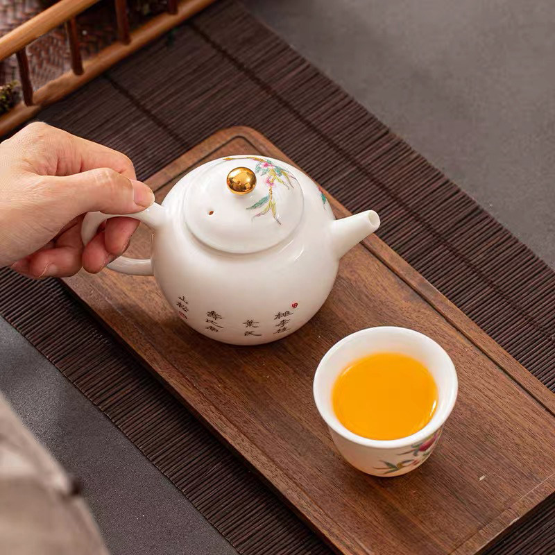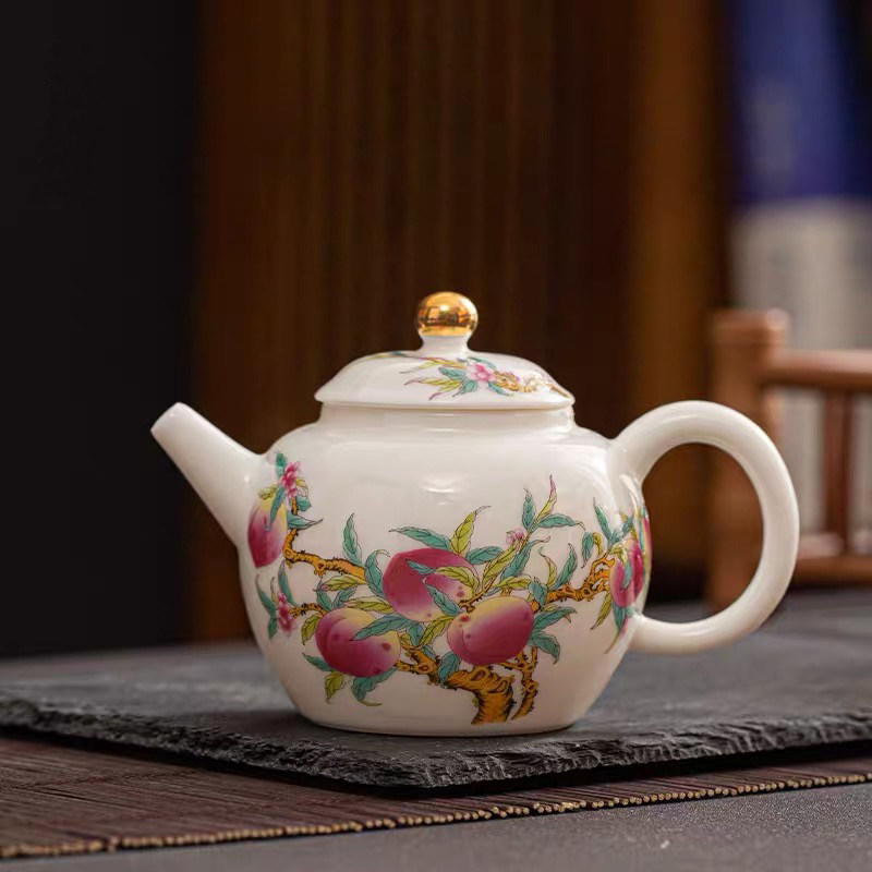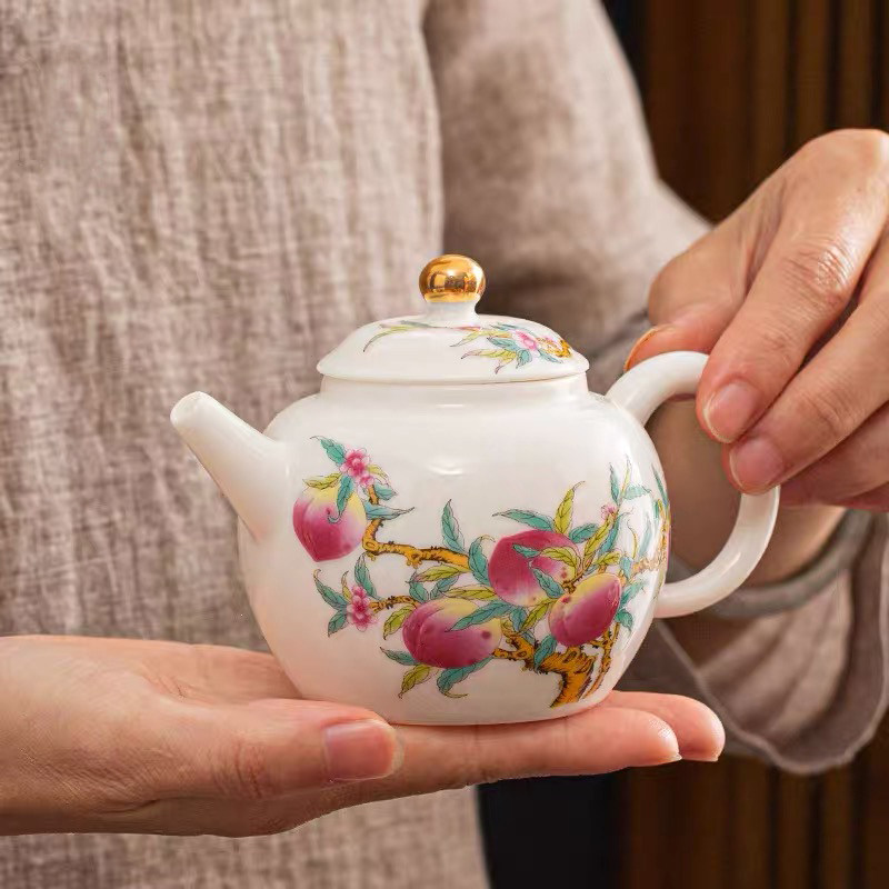 📚 羊脂玉寿桃茶壶景德镇陶瓷家用粉彩桃子泡茶壶功夫茶具单个泡茶器