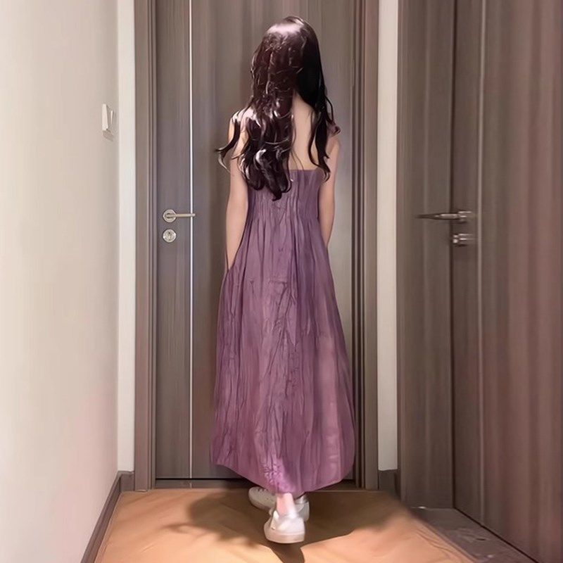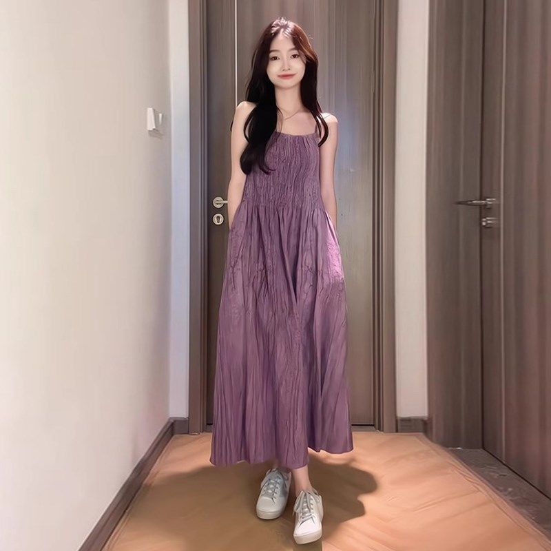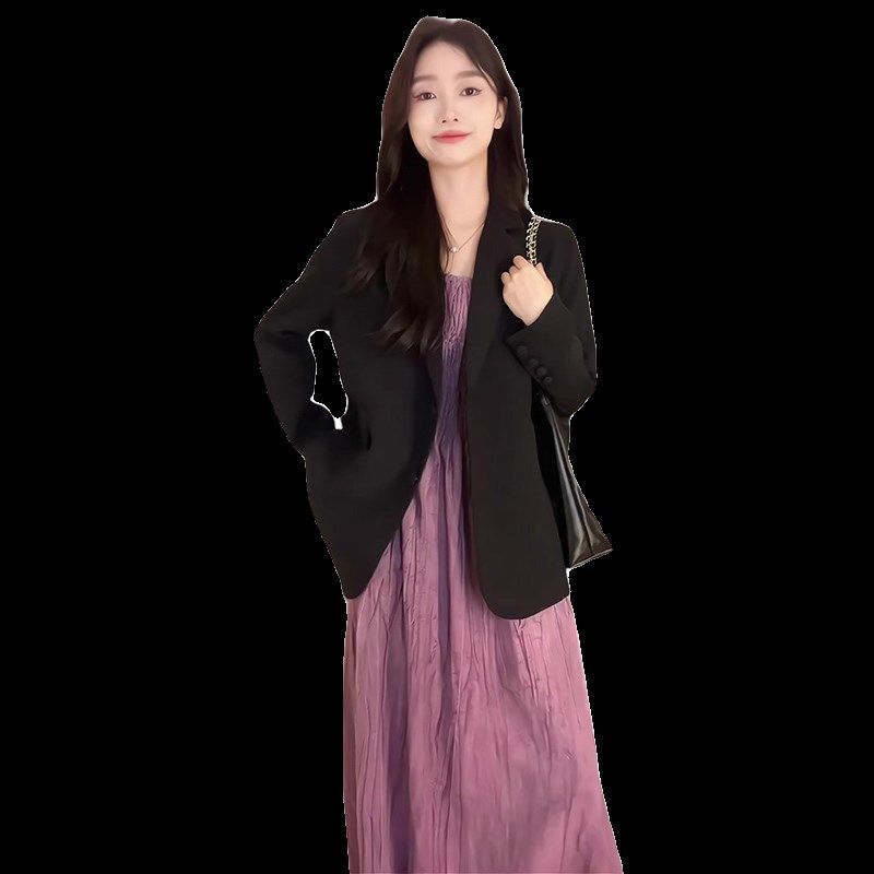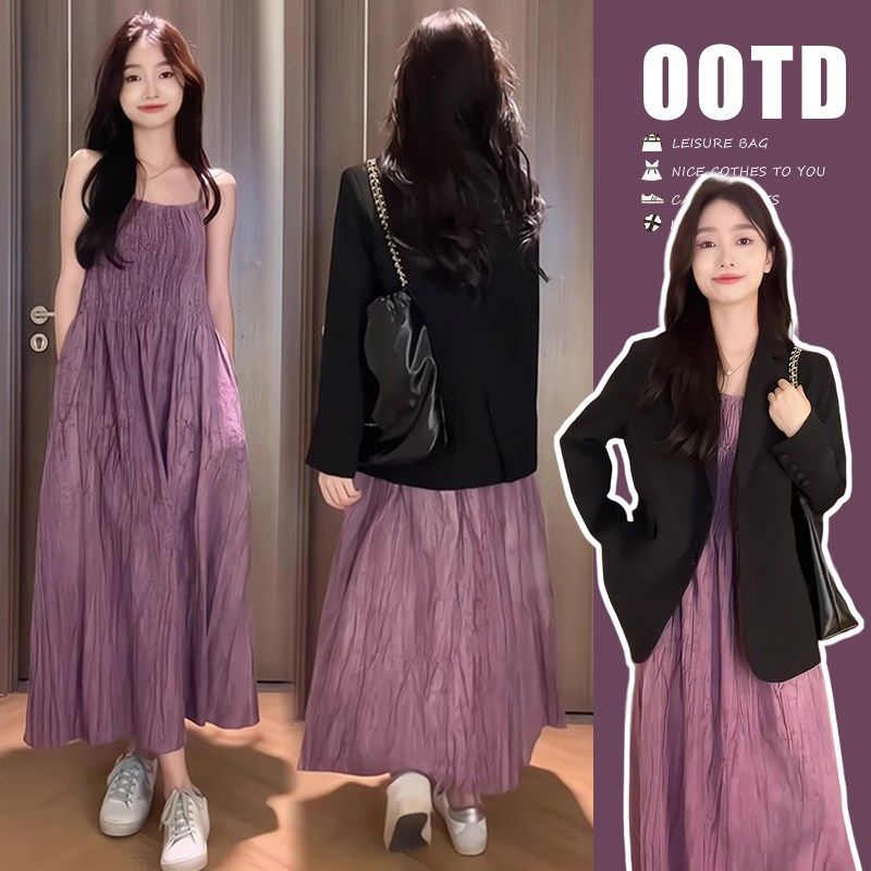 📚 孕妇连衣裙春秋季新款简约紫色吊带连衣裙+黑色T西装外套两件套装