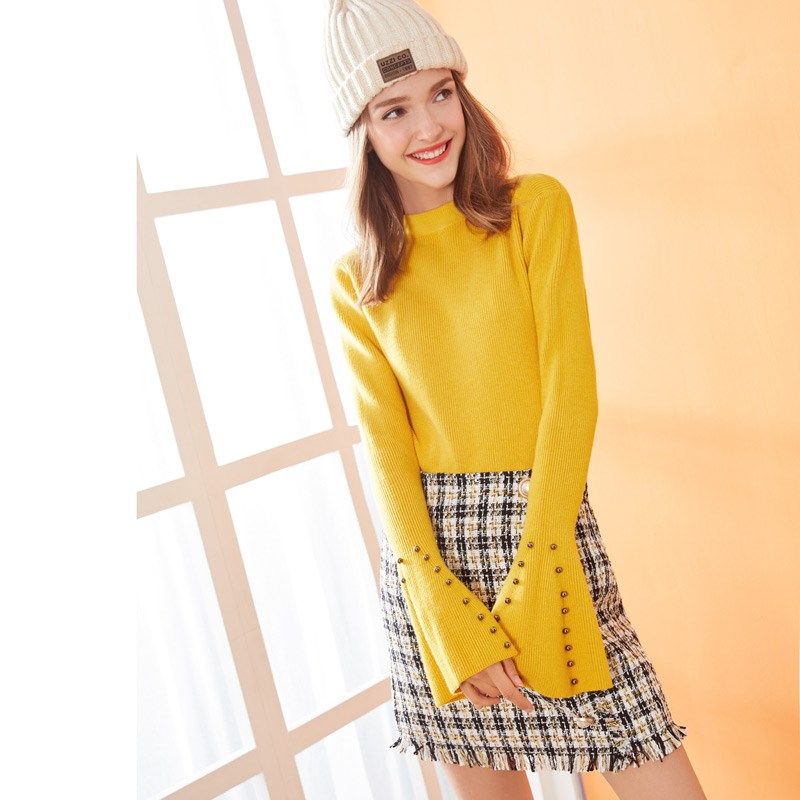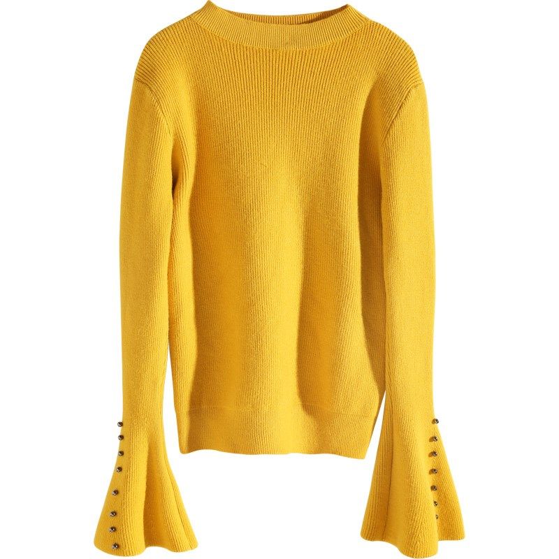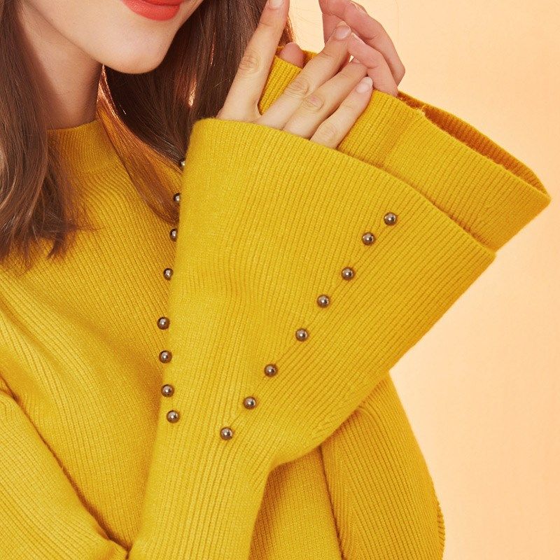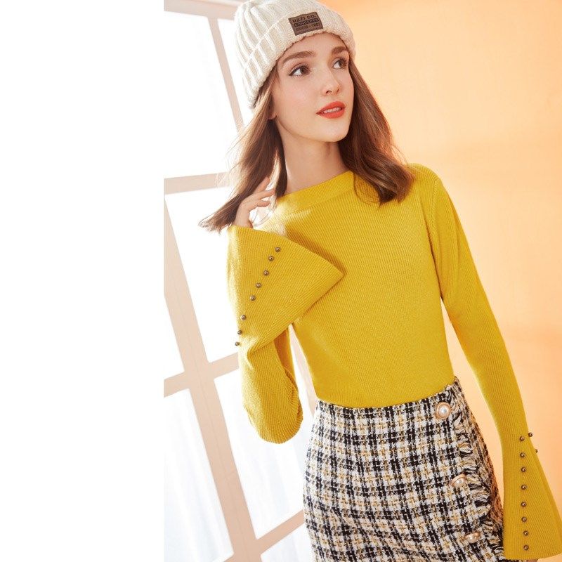 📚 钉珠喇叭袖毛衣黄色温柔风长w袖圆领上衣韩版打底衫2025春秋新品