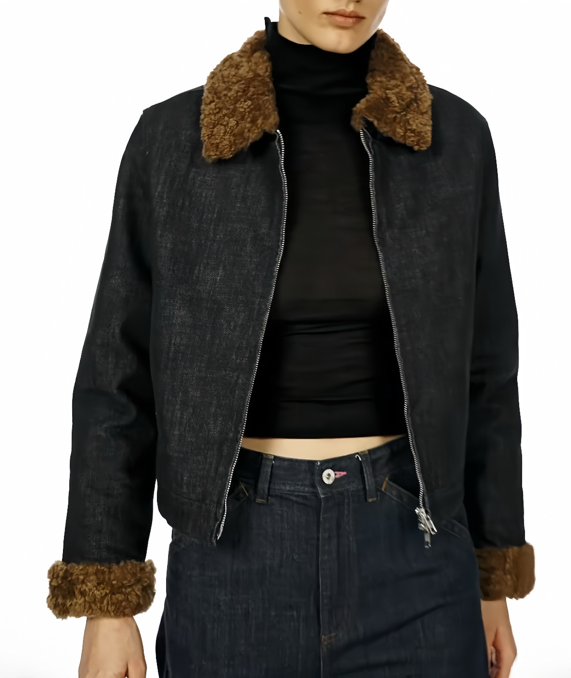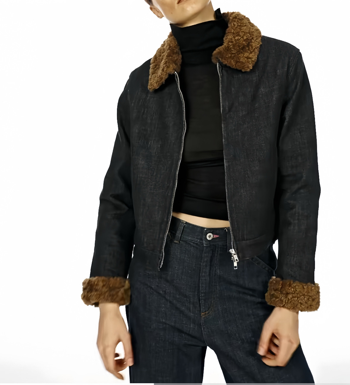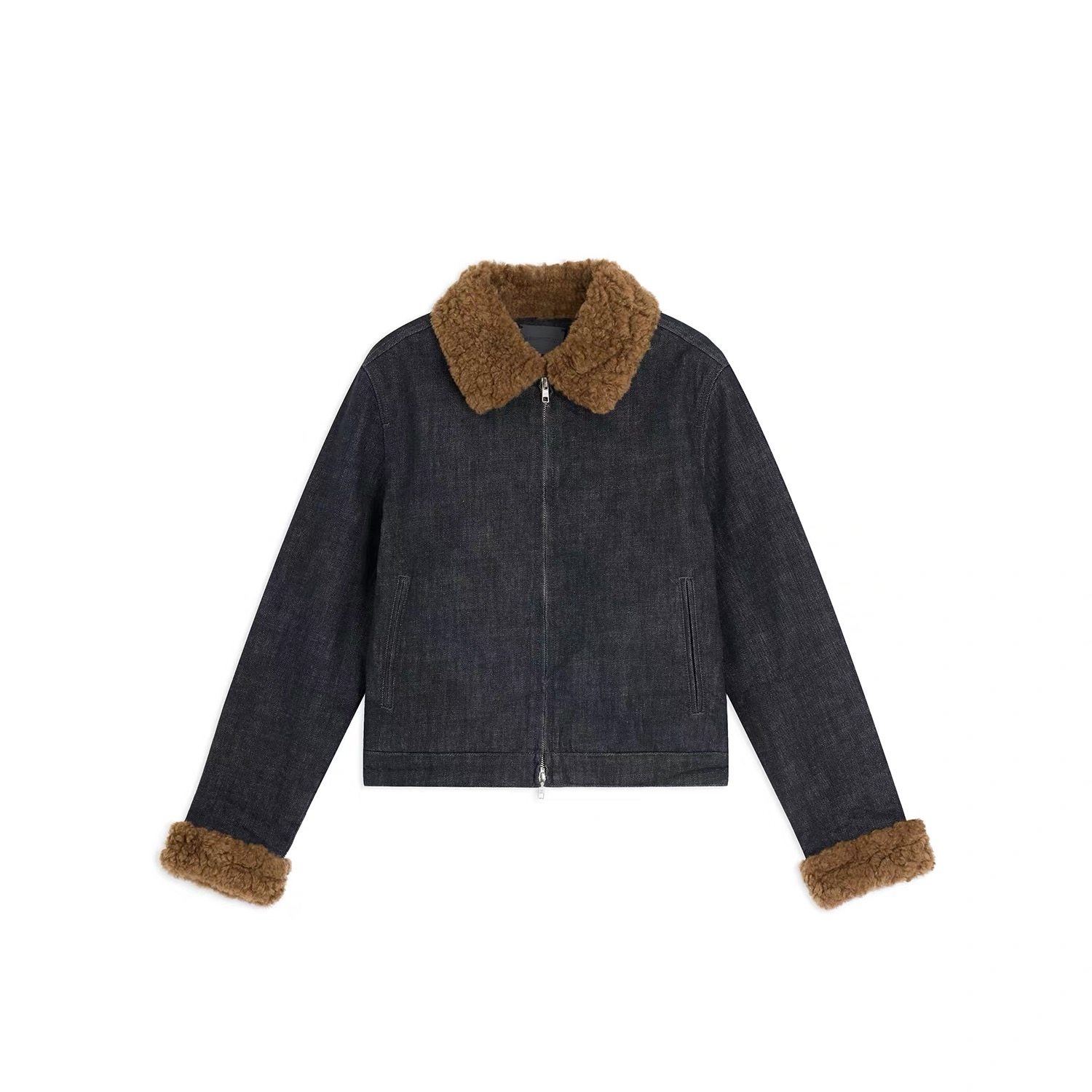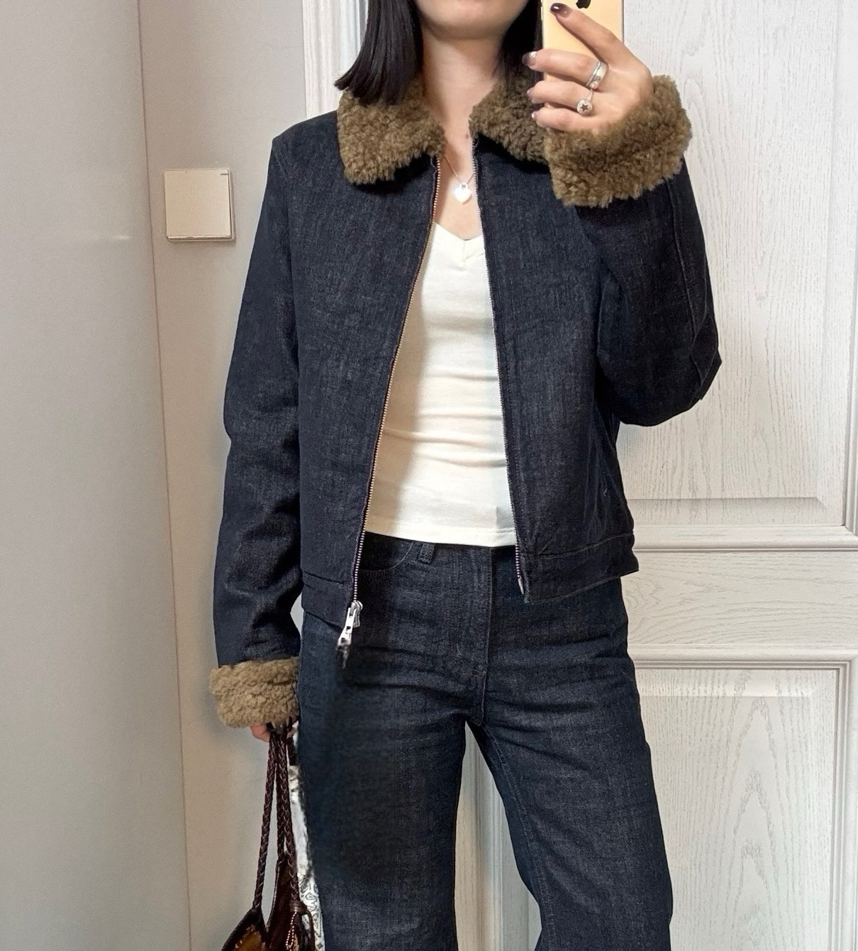 📚 alright高品质丹宁拼接棉混纺黄色格纹短款H版型牛仔拼毛翻领外套