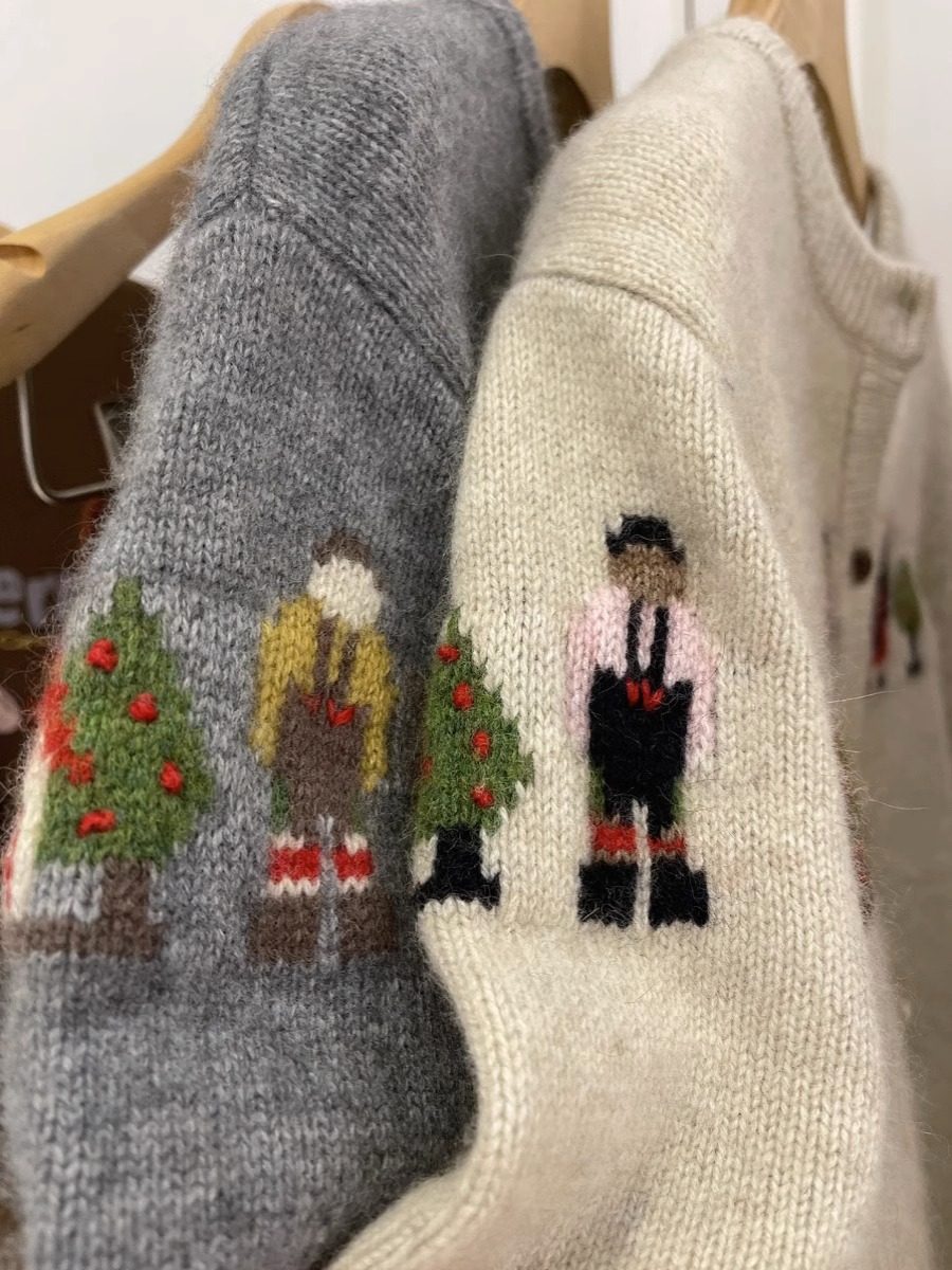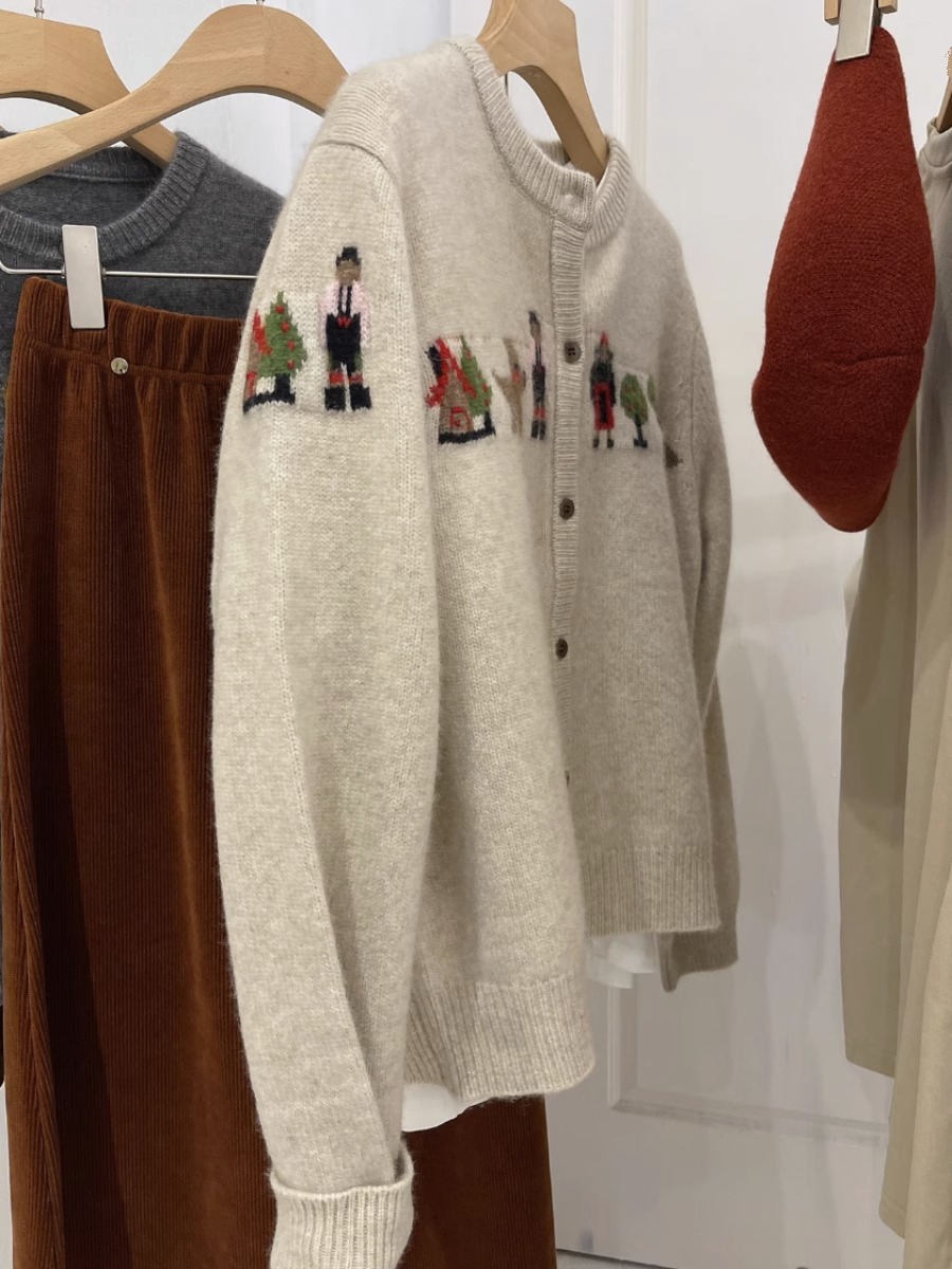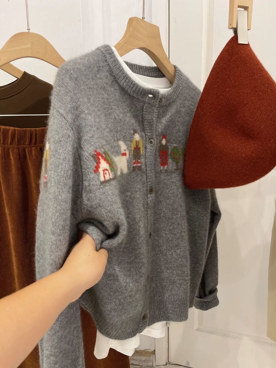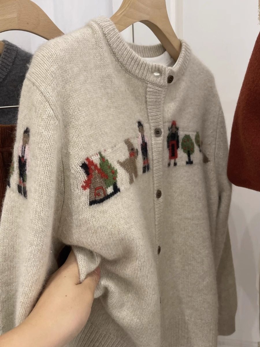📚 趣味卡通刺绣提花宽松古着毛衣开衫女2023秋款宽松显瘦羊毛针织衫
