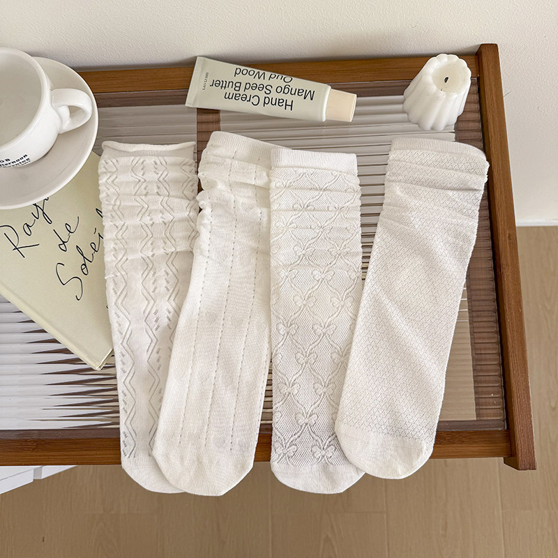 📚 抗起球春夏季薄款白色百搭镂空网眼中筒女袜袜子女暗花直板棉袜