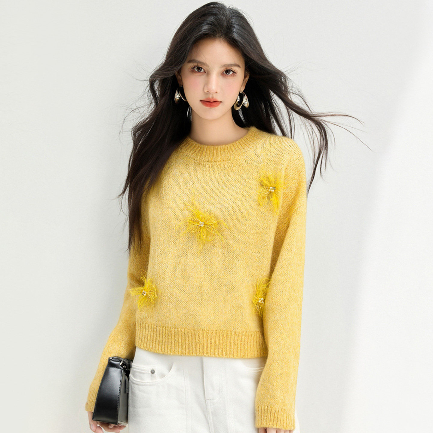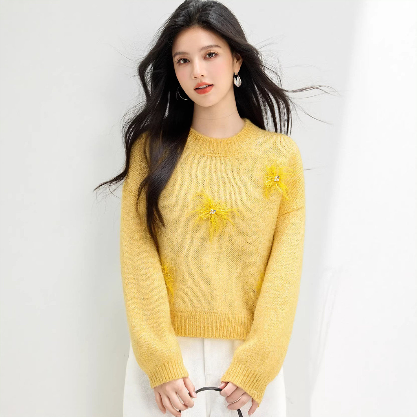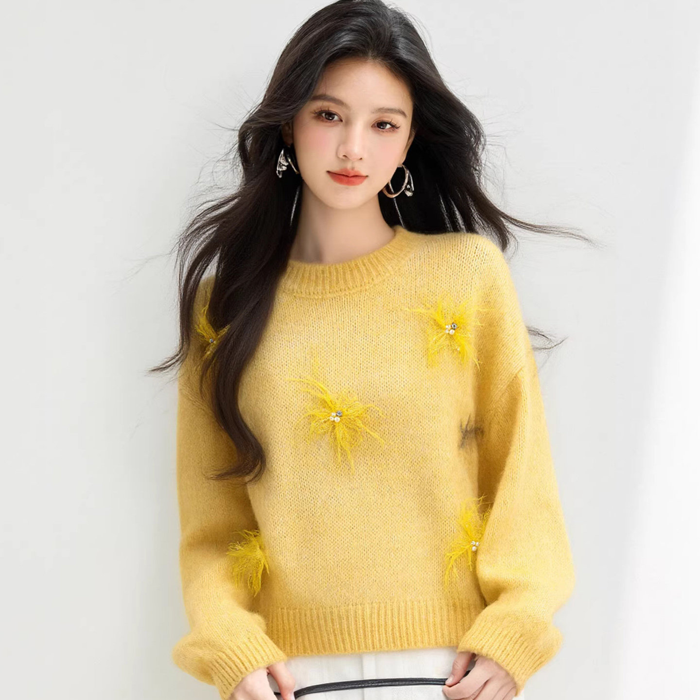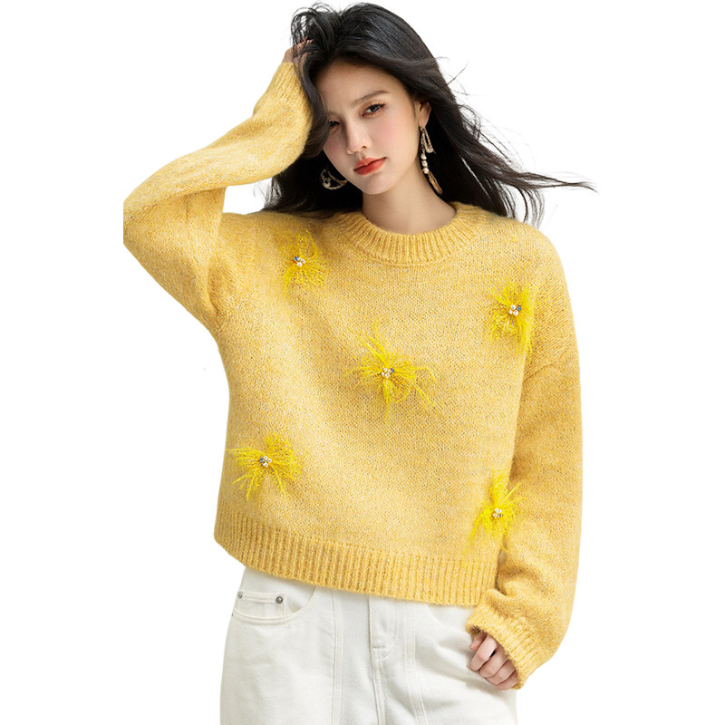 📚 黄色厚实保暖冬宽松圆领钉珠设计针织衫休闲时髦上衣