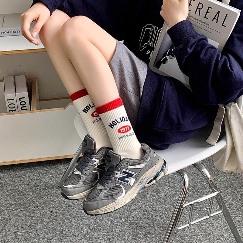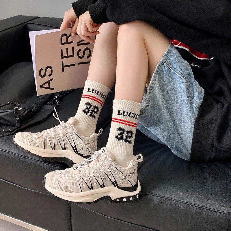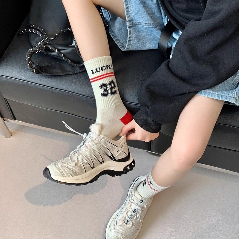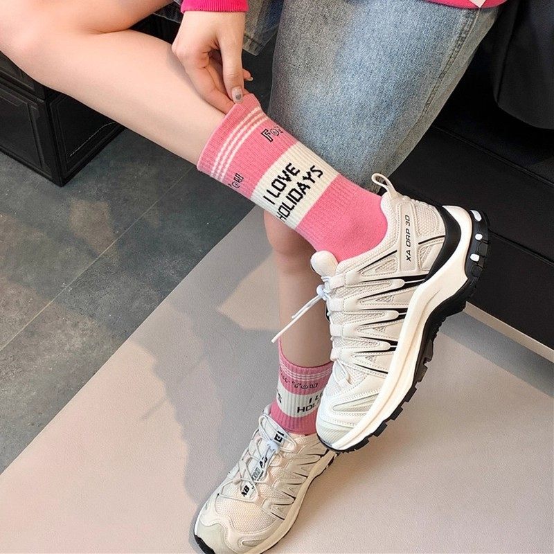 📚 粉红色袜子女中筒袜ins潮秋冬季白色字母运动街头长筒袜夏天外穿