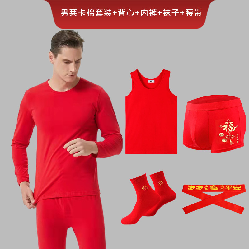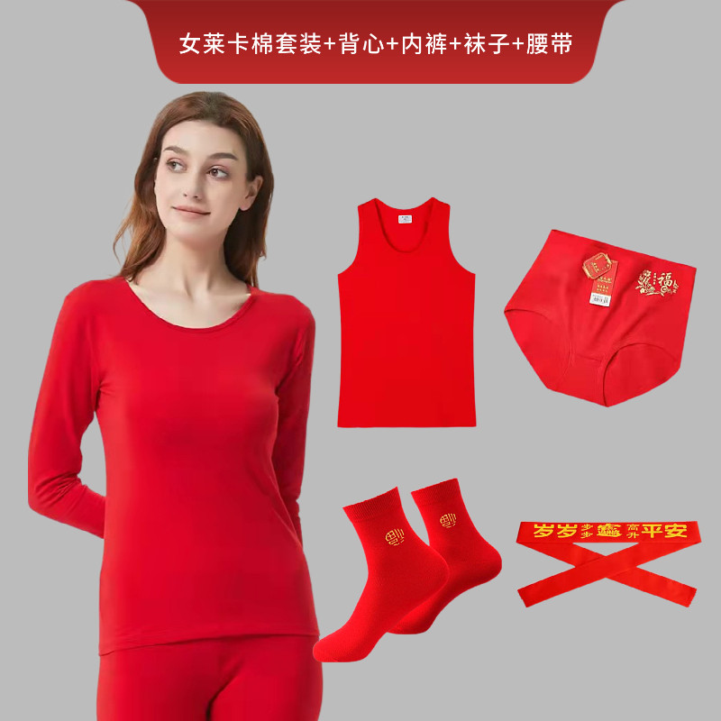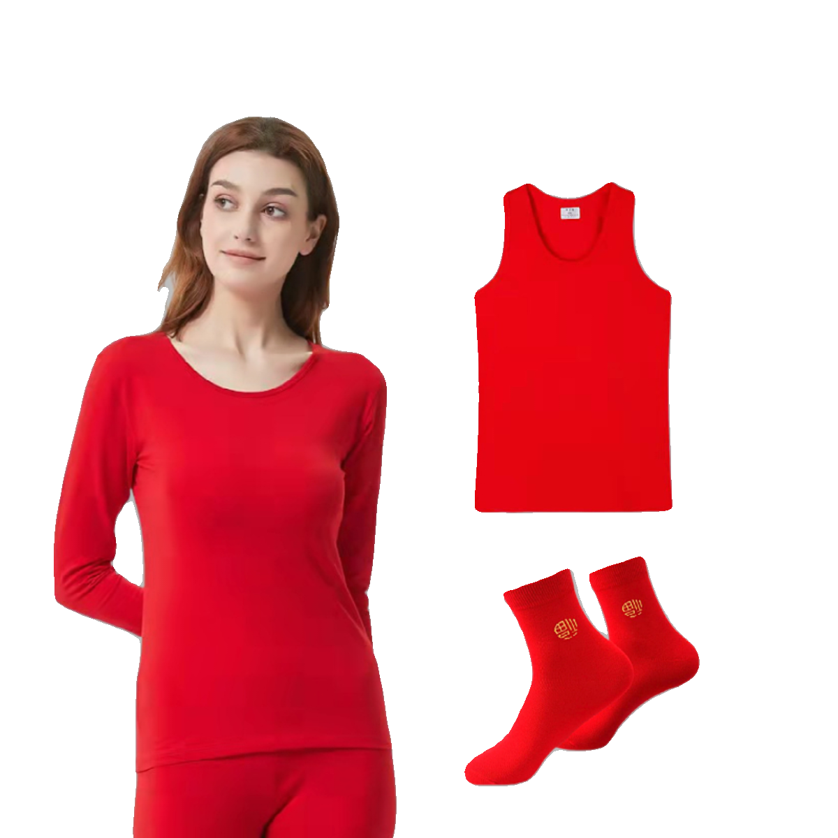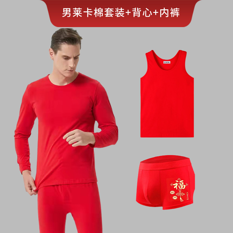 📚 男大红本命年套装结婚秋衣秋裤女薄款修身长袖大红色衬衣衬裤内穿