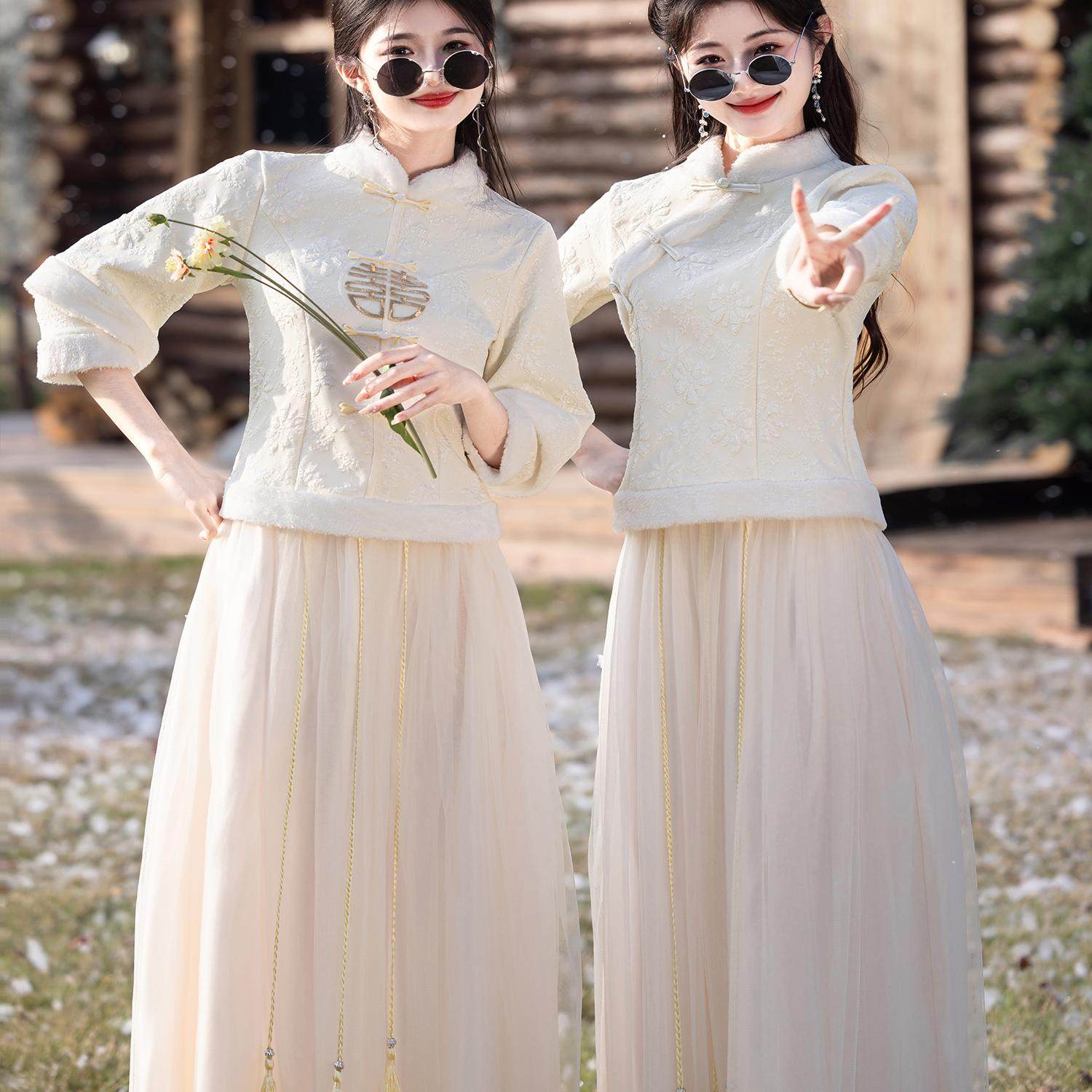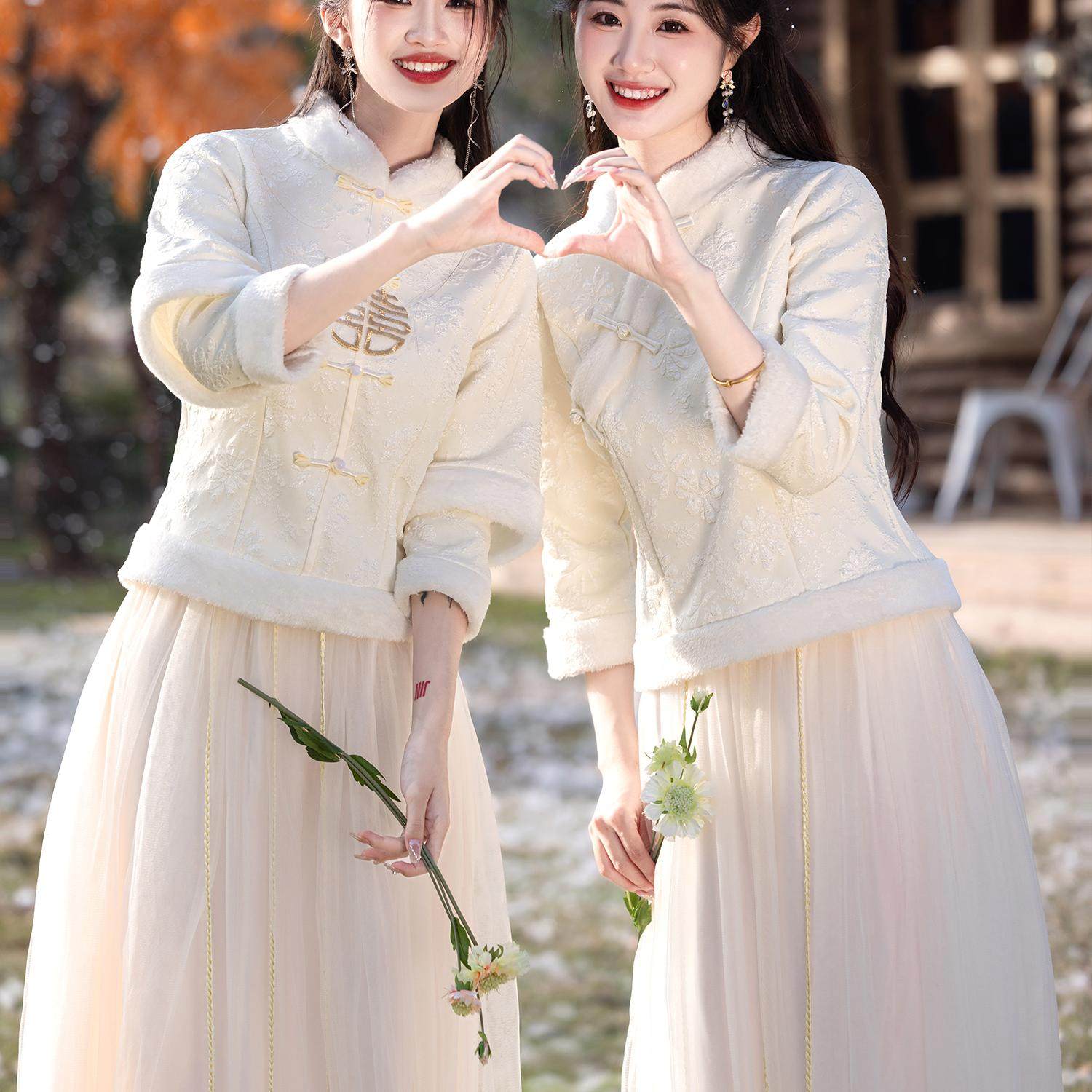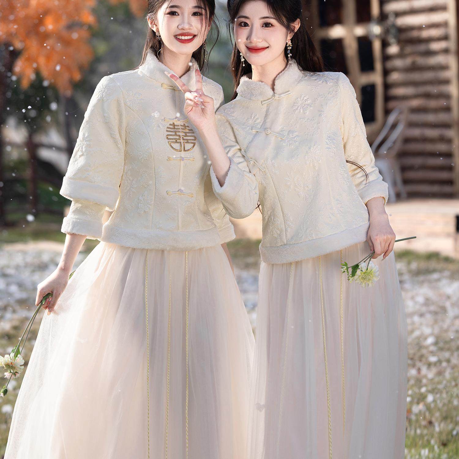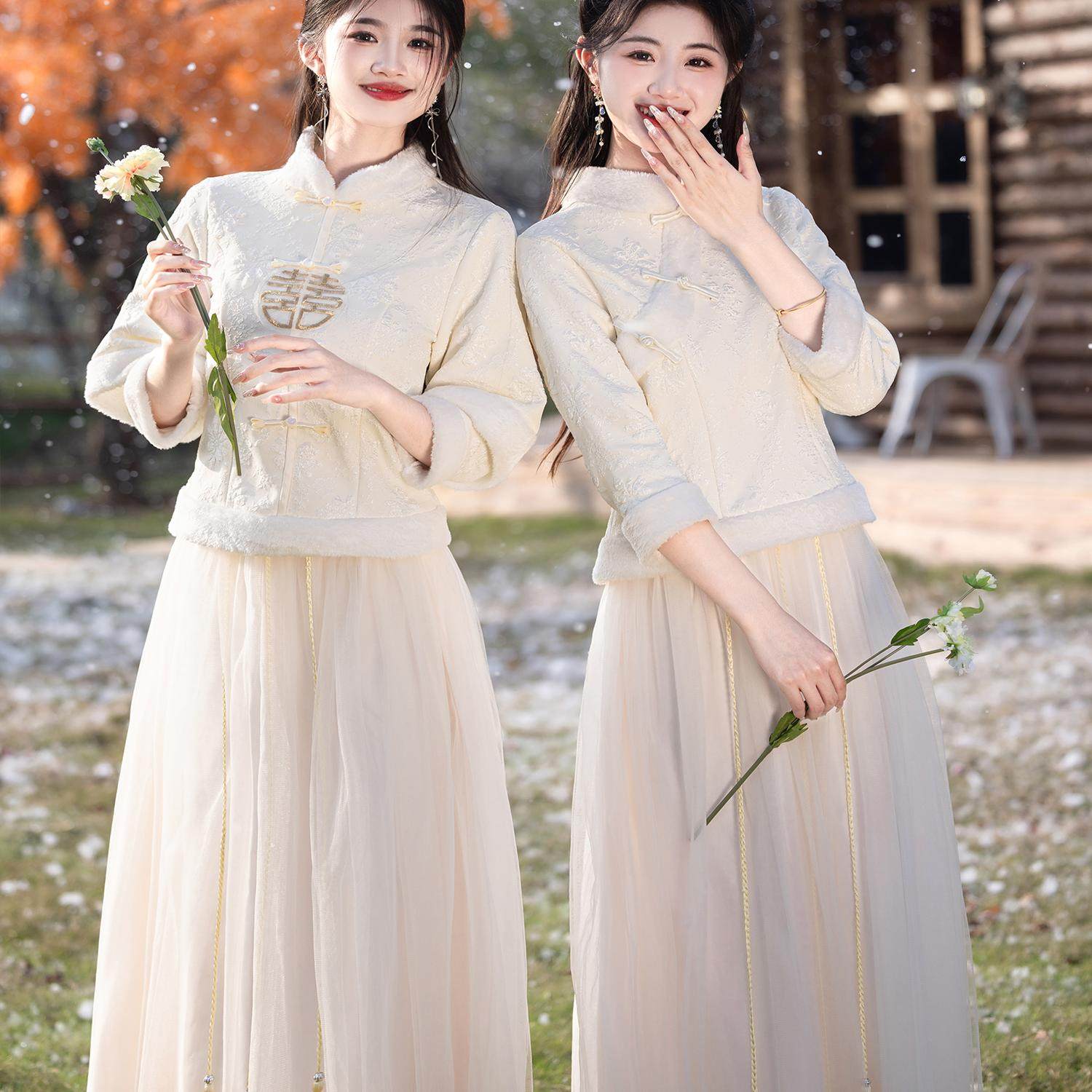 📚 中式伴娘服2024秋冬新款中国风姐妹团平时可穿轻奢礼服裙加绒加厚