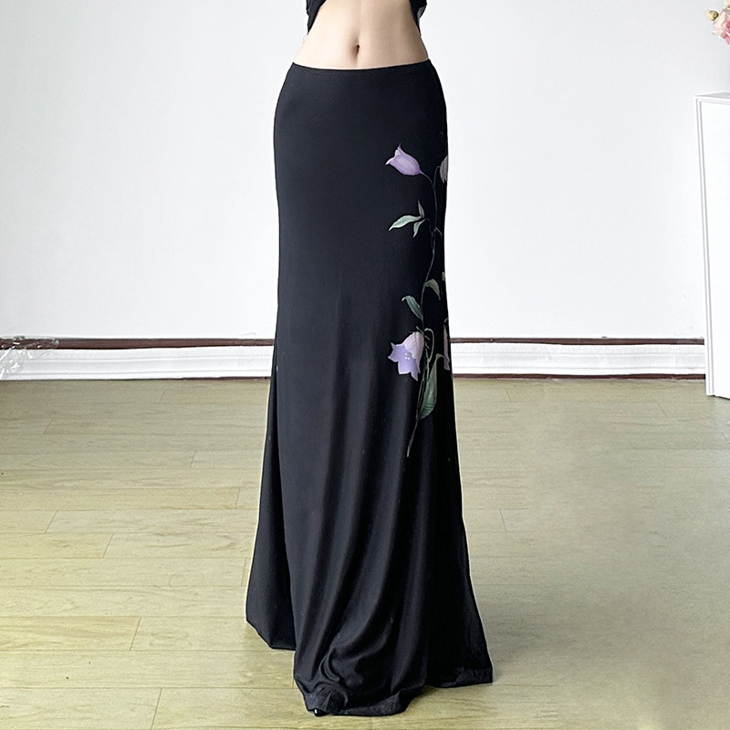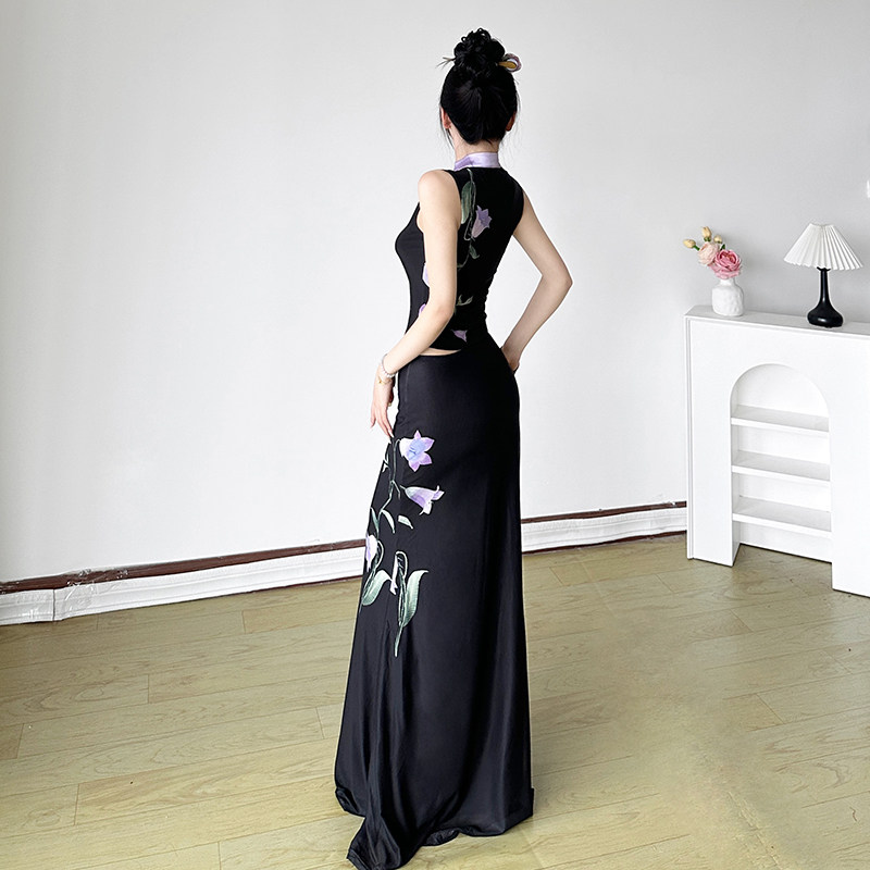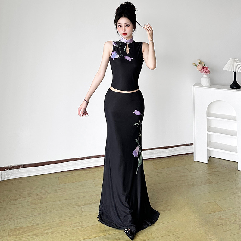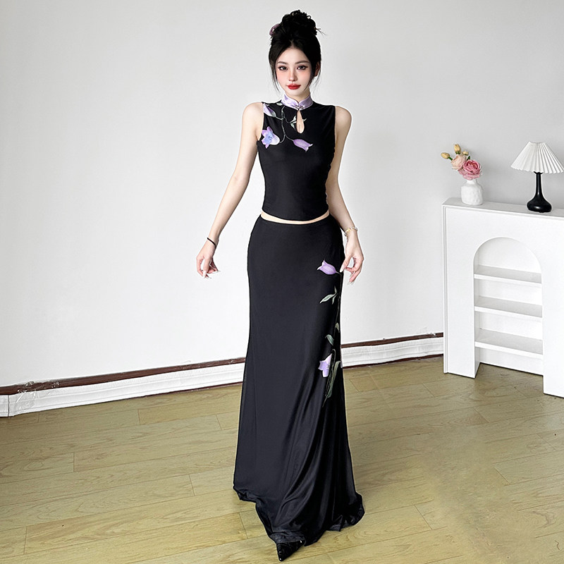 📚 HEYOUNGIRL新中式紫色花卉印花旗袍领背心直筒黑色长裙国风套装女